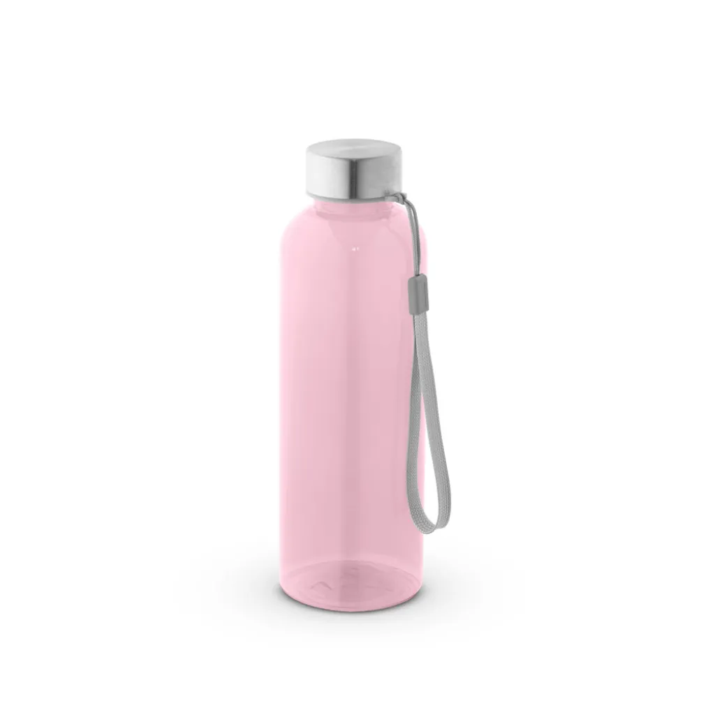 Bottle in recycled PET (100% rPET) with a translucent glossy finish. Leak-proof stainless steel lid with polyester rope for easy transport. Capacity up to 600 mL. ø65 x 210 mm