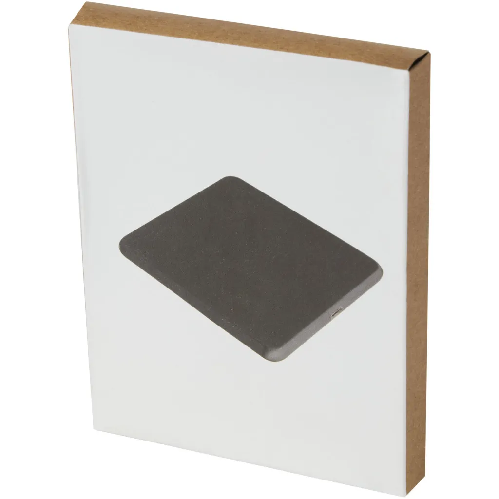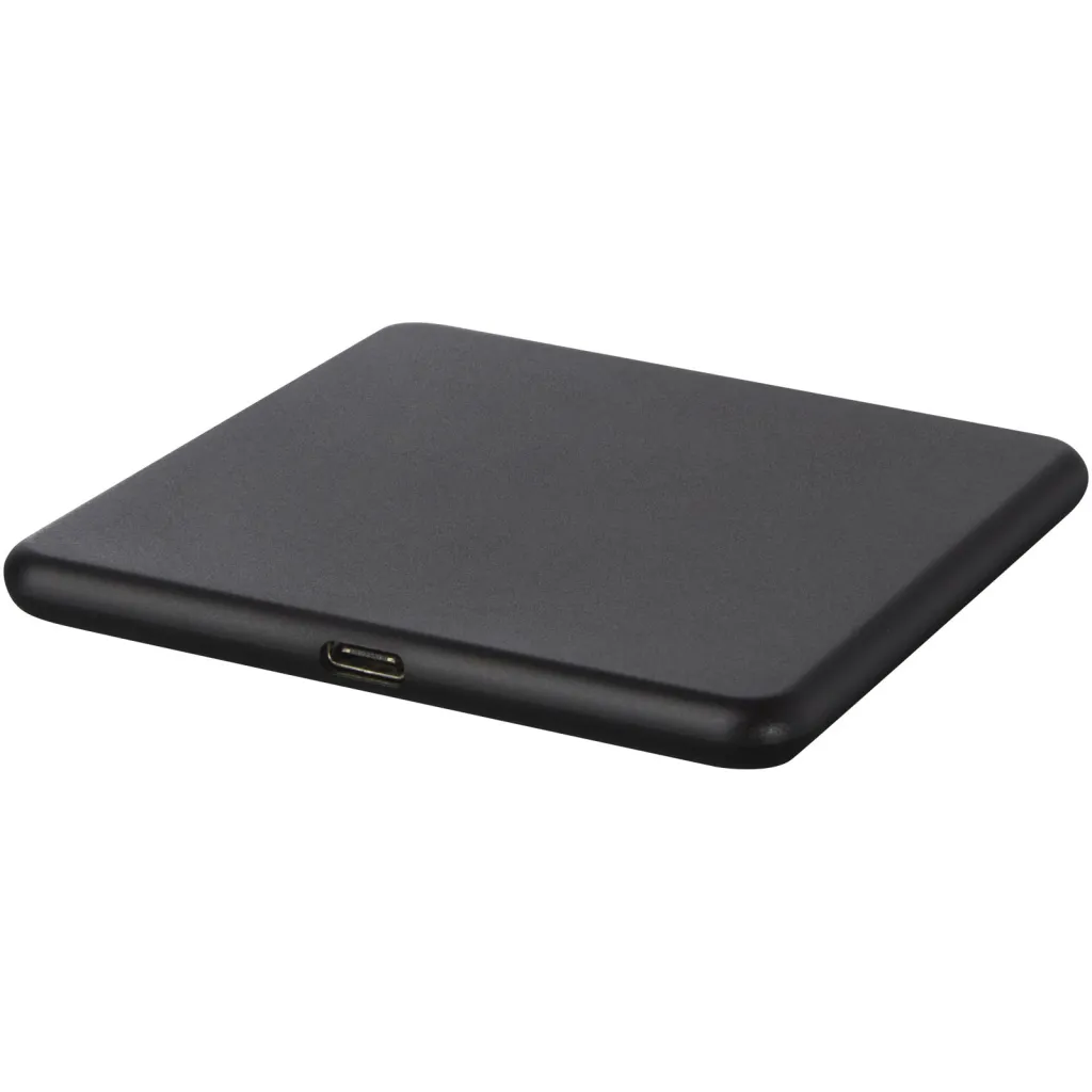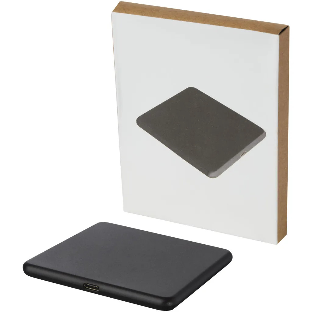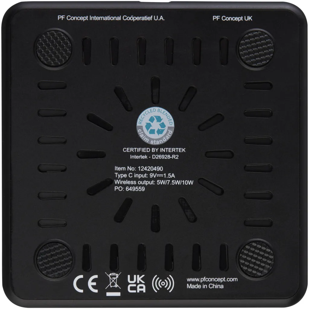 Wireless charging pad made of RCS certified recycled ABS plastic. RCS (Recycled Claim Standard) is a standard to verify the recycled content of a product throughout the entire supply chain. Connect the charging pad to a computer or laptop and place the device on top to start charging. Wireless output is 10W (max) for quick charging. Compatible with all Qi devices (iPhone 8 or above and Android devices that supports wireless charging). Delivered in a gift box with an instruction manual (both made of sustainable material).