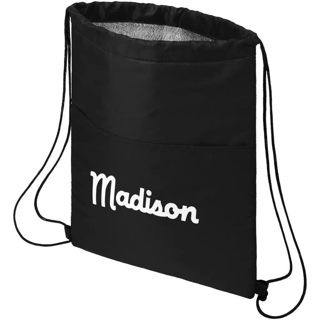 Drawstring cooler bag with string closure in black colour. Features an open front pocket. Fits 12 cans. Resistance up to 5 kg weight.