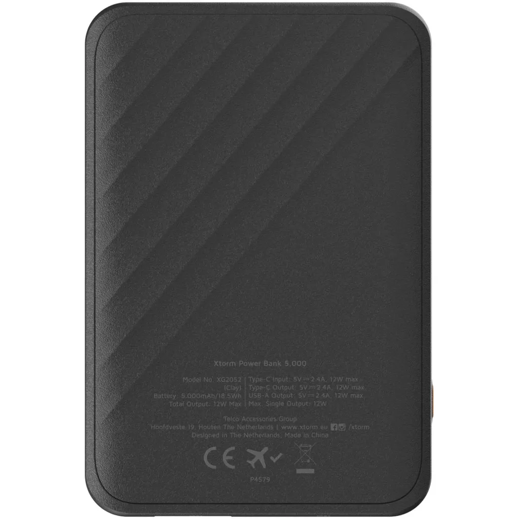 Small and compact 5000 mAh power bank, providing at least one full charge for a smartphone or earbuds. The power bank has 2 USB ports and charges extra fast thanks to the 12W FastCharge technology from Xtorm.