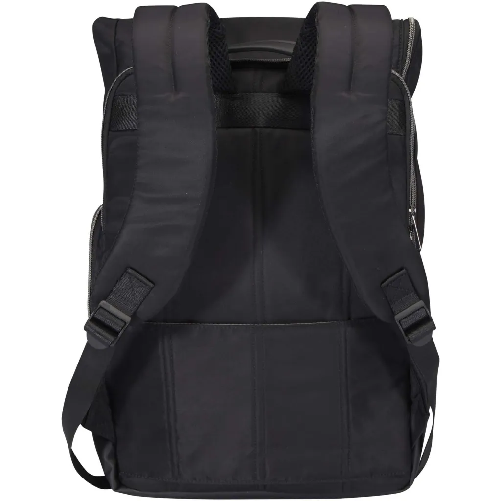 The Rhine rolltop backpack enables you to shift between work and leisure life seamlessly with its sleek style and versatility. Crafted with high-quality GRS certified recycled nylon, soft RPET lining, and premium PU leather elements. The backpack features a dedicated 15” laptop compartment with 2 additional pockets for electronic accessories, a main compartment with a practical L-zip entry and 2 pockets, a zipped organisational front pocket, and a side pocket. Enjoy maximum carrying comfort with the padded and adjustable shoulder straps, and PU wrapped top handle. Volume capacity: 18 litres. Resistance up to 10 kg weight. PVC free.