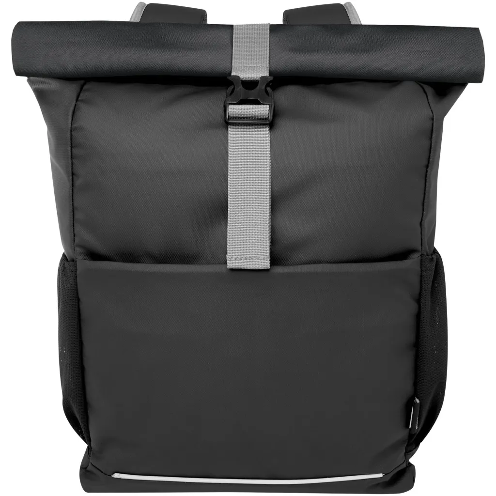 Water-resistant roll-top bike bag made from GRS certified recycled materials. It features a padded 15" laptop compartment, multiple organisational pockets, adjustable hook & loop closure for easy fitting onto a variety of bikes, and reflective piping for visibility. The GRS recycled materials include the main fabric, lining, webbing, and zips. Capacity: 20 litres. PVC free.