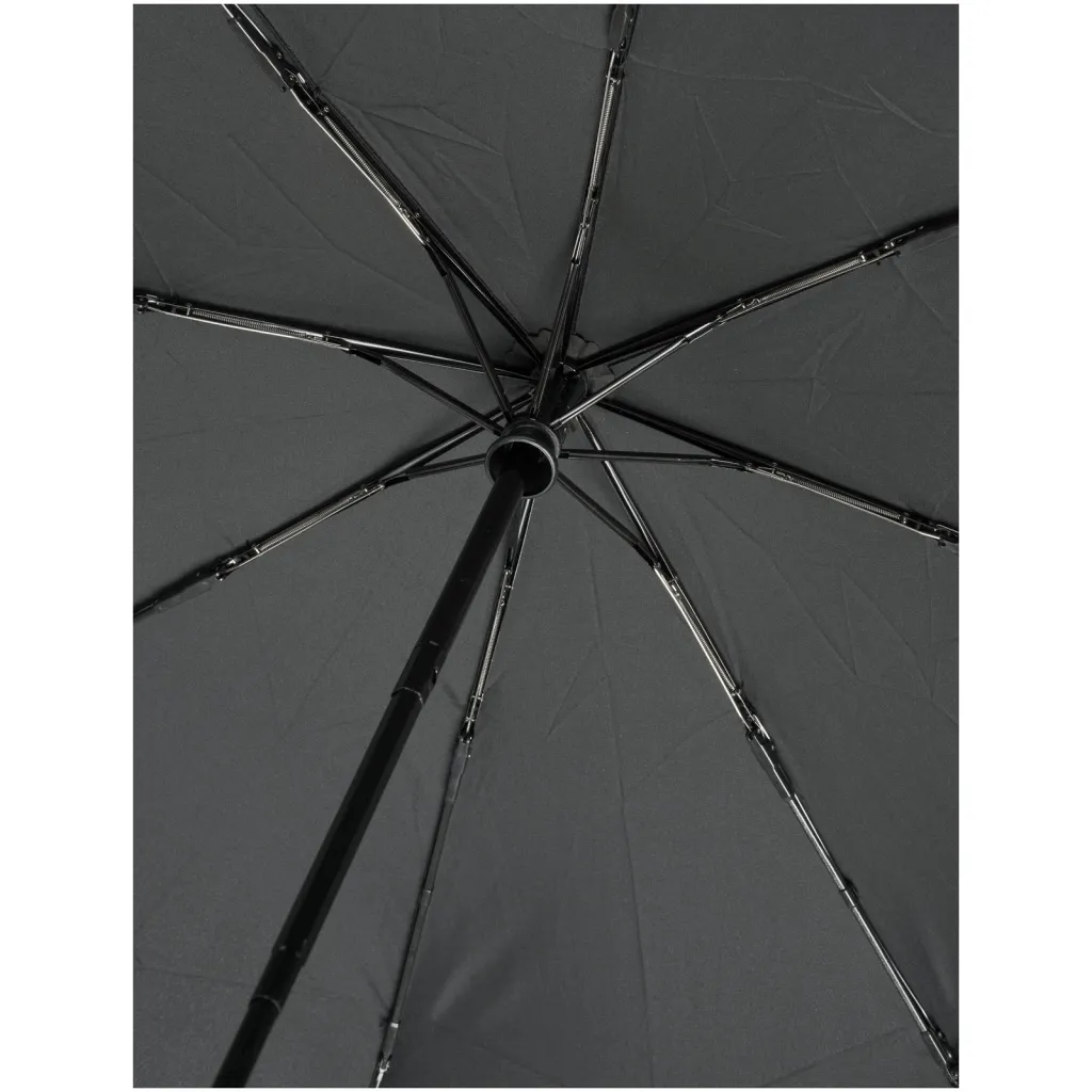 Automatic open and close folding umbrella with a recycled PET pongee polyester canopy. Sturdy metal shaft, a high quality frame with fibreglass ribs offering maximum flexibility in windy conditions. Supplied with a pouch and can easily fit a handbag or backpack for convenient carrying. Together with the wooden handle and the recycled PET pongee polyester canopy it offers a sustainable choice. Available in an wide variety of contemporary colours with a large decoration area on each of the panels.