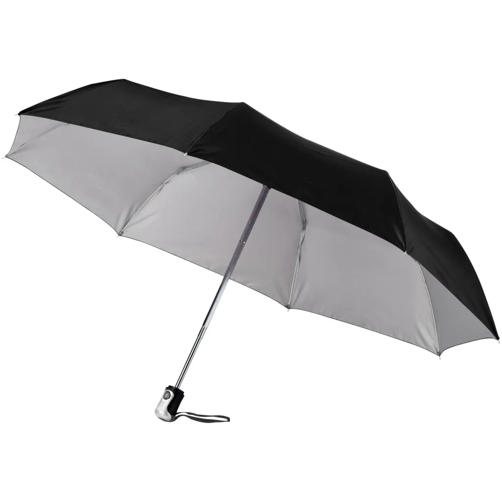 21.5" 3 section umbrella with automatic opening and closing button. Metal frame and ribs and plastic handle. Supplied with a pouch.