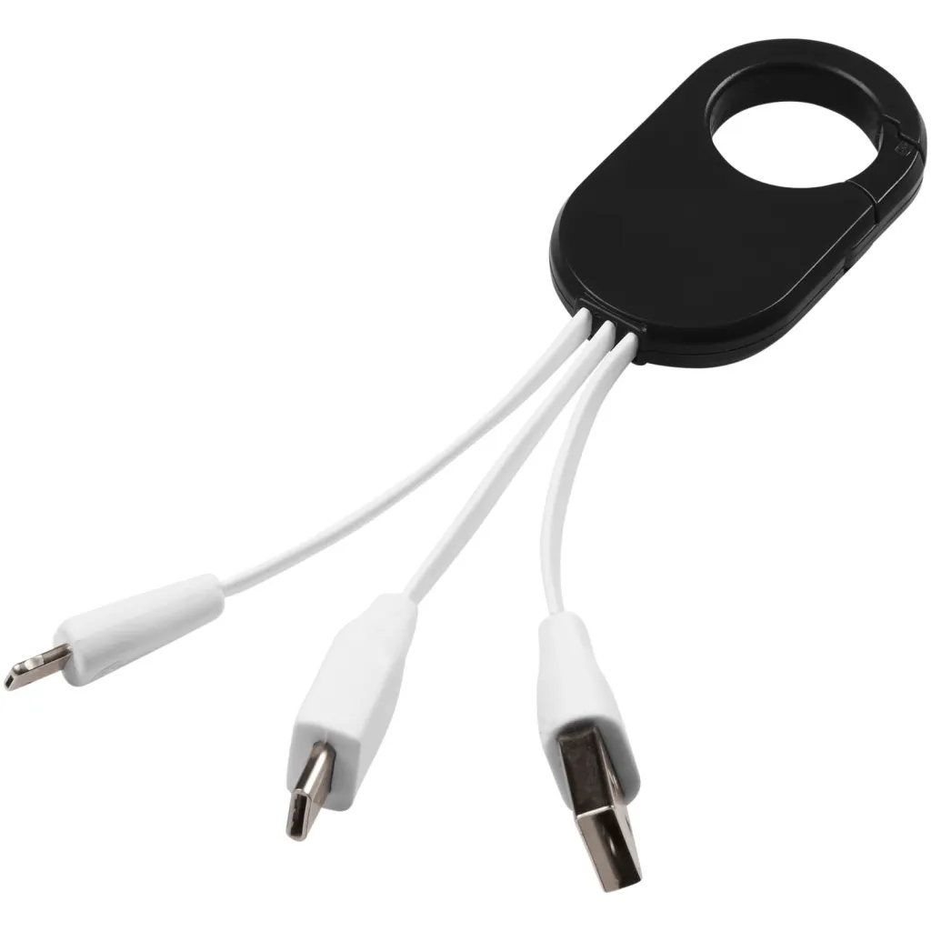The Troop 3-in-1 charging cable features a USB type C tip and a 2-in-1 dual compatible tip for both Apple® iOS and Android devices. It has a carabiner clip to easily hook on your bag.
