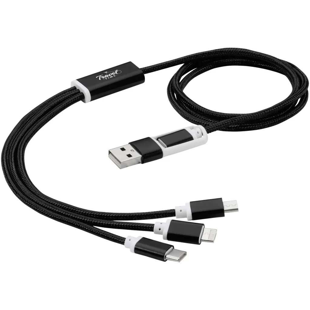 Braided nylon charging cable with 5 different connectors: Type-C input, USB-A input, Type-C output, Apple® iOS output, and micro USB output. This allows for using the cable also with Type-C output devices that are included in the newer generation of phones and MacBook computers. Cable length is 100 cm. 2-in-1 tip output up to 2A. Type-C output up to 3A current.
