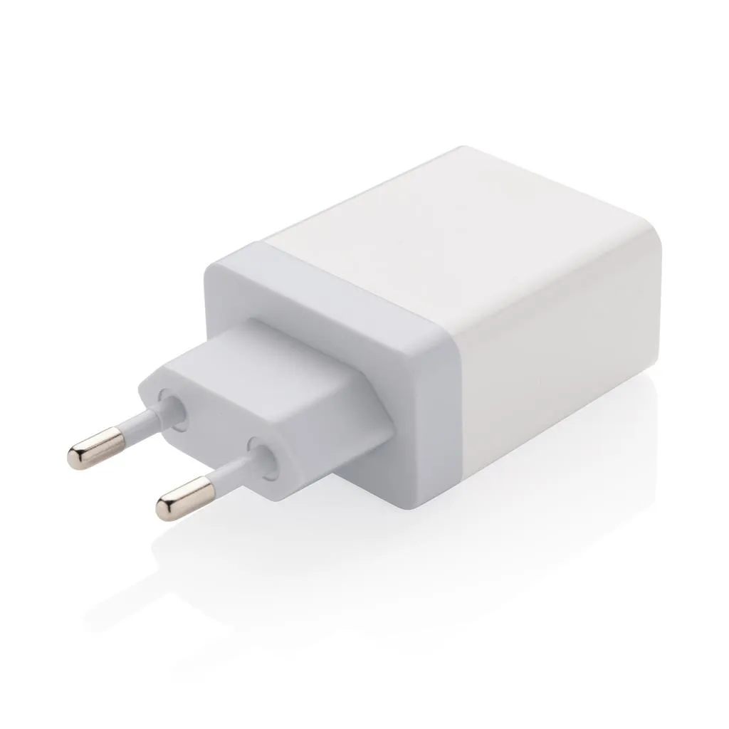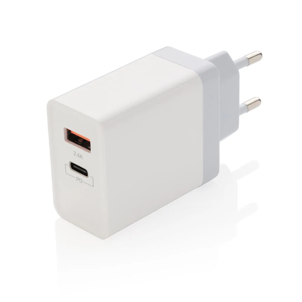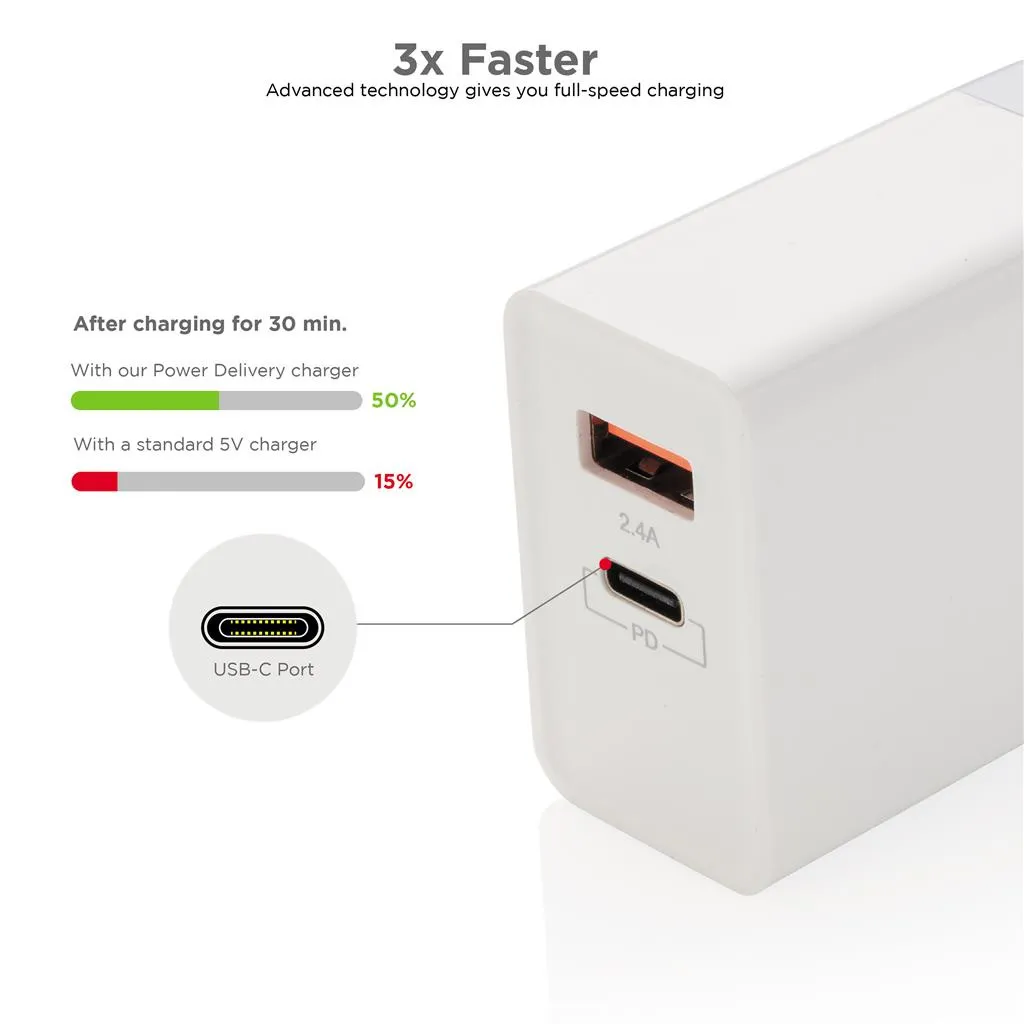 Super fast 30W ABS material wall adapter with power delivery. The charger comes with a one USB 2A output port and one type C output that support power delivery fast charging. This will allow you to charge your mobile device under one hour if it supports PD charging. Input 100-240V; Type-C output (PD): 5V/3A,9V/2A,12V/1.5A; USB output: 5V/2.4A (max) Total Power: 30W.