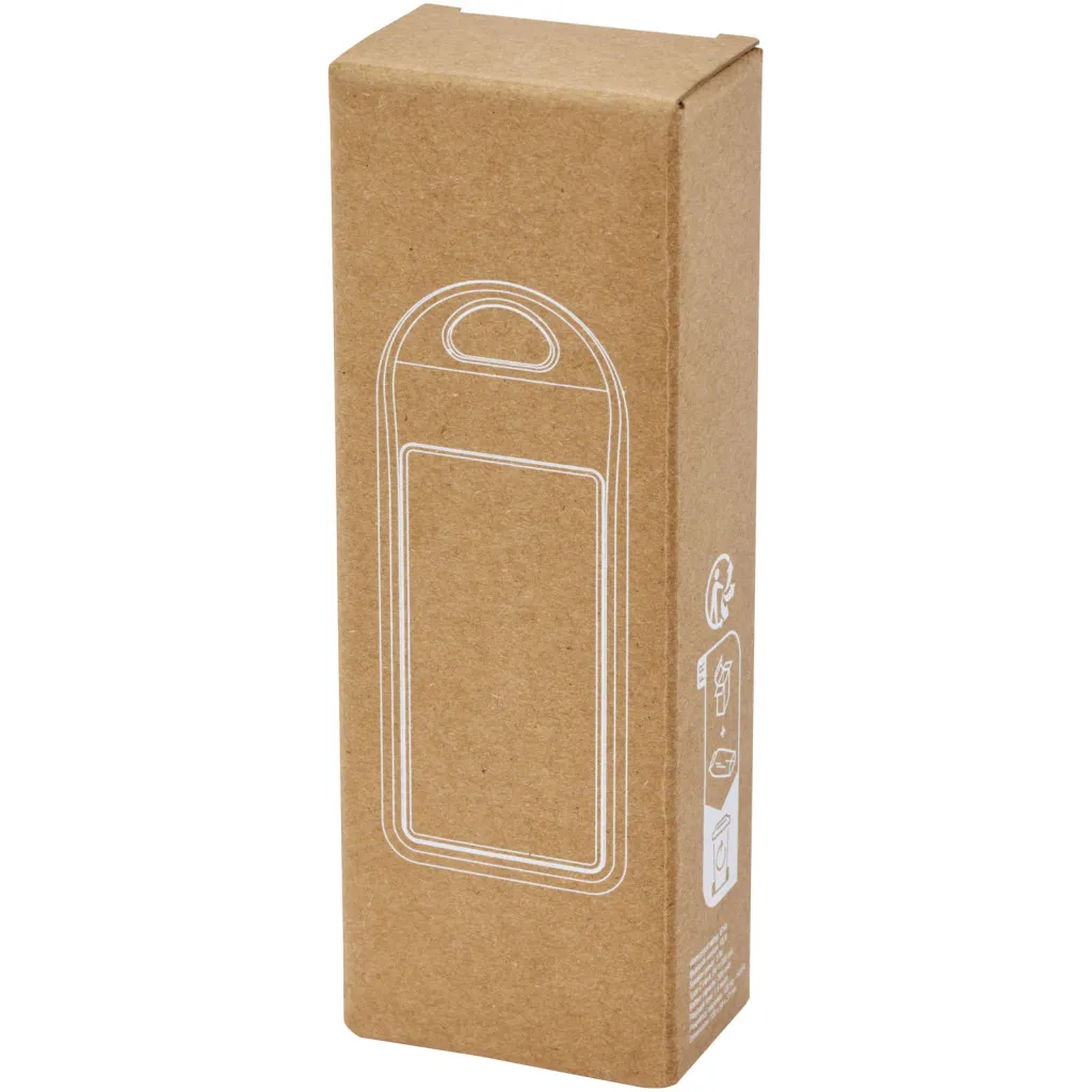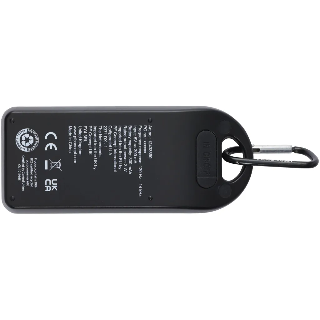 RCS recycled 3W Bluetooth® speaker that plays music, podcasts etc. from any Bluetooth® enabled device, making it an ideal companion for any occasion. Thanks to the included carabiner the speaker can easily be attached to a backpack, and the IPX4 rating protects it against occasional rain. Enjoy up to 1.5 hours of music at maximum volume due to its 300 mAh Li-ion battery. The charging time is 1.5 hours. Bluetooth® 5.0 with a working range of approximately 10 metres. Delivered with a user manual, a carabiner, a 50 cm USB-A to Type-C charging cable, and packed in a 100% recycled kraft paper box.
