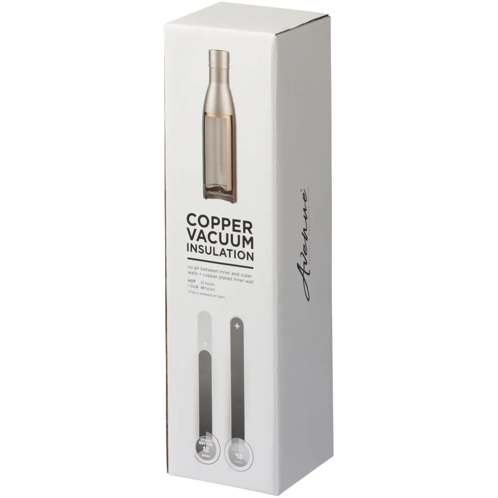Keep your drinks hot for 12 hours or cold for 48 hours with the Vasa copper vacuum insulated bottle. Double walled and made from 18/8 grade stainless steel with vacuum insulation and a copper plated inner wall means your beverage is kept piping hot or ice cold depending on your requirements. Volume capacity is 500ml. Presented in an Avenue gift box.