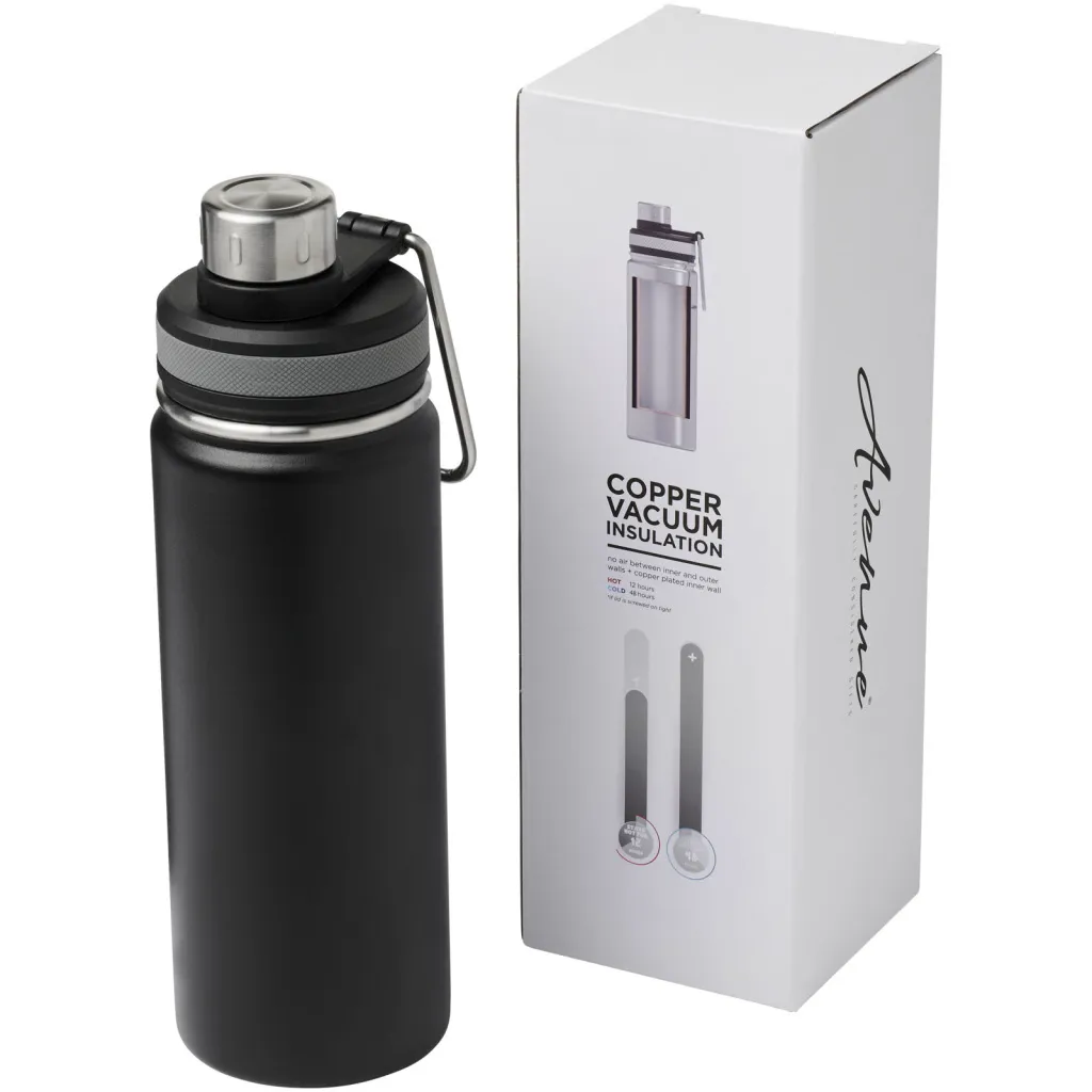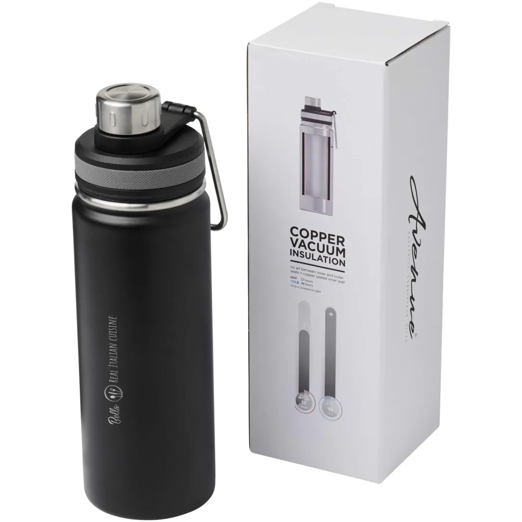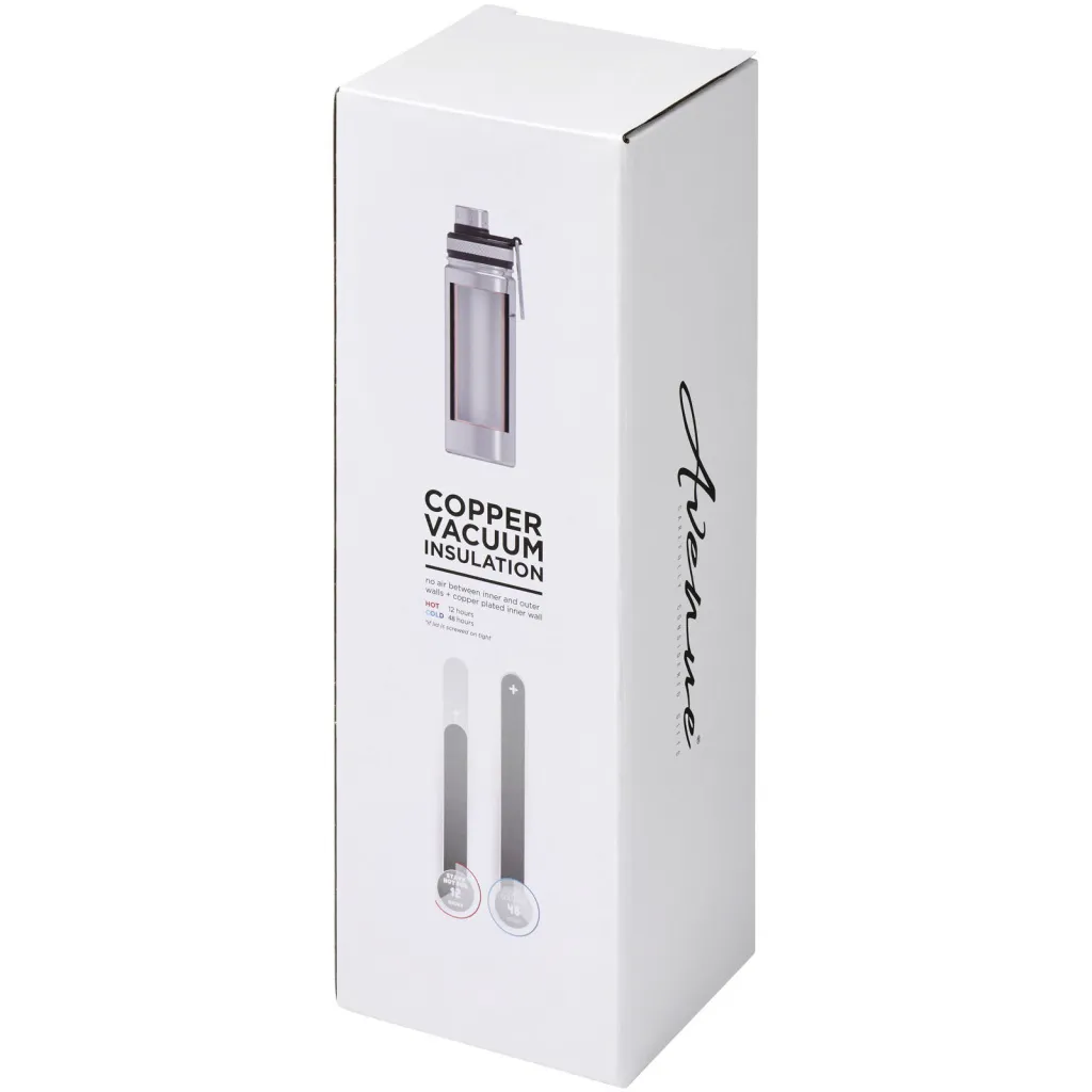 Double-walled stainless steel vacuum construction with copper insulation, which keeps beverages hot for at least 12 hours and cold for 48 hours. The construction also prevents condensation on the outside of the bottle. Features a screw-on top and stainless steel lid with a convenient handle for carrying. Dual opening construction for easy cleaning and filling. Volume capacity is 590 ml. Presented in an Avenue gift box.