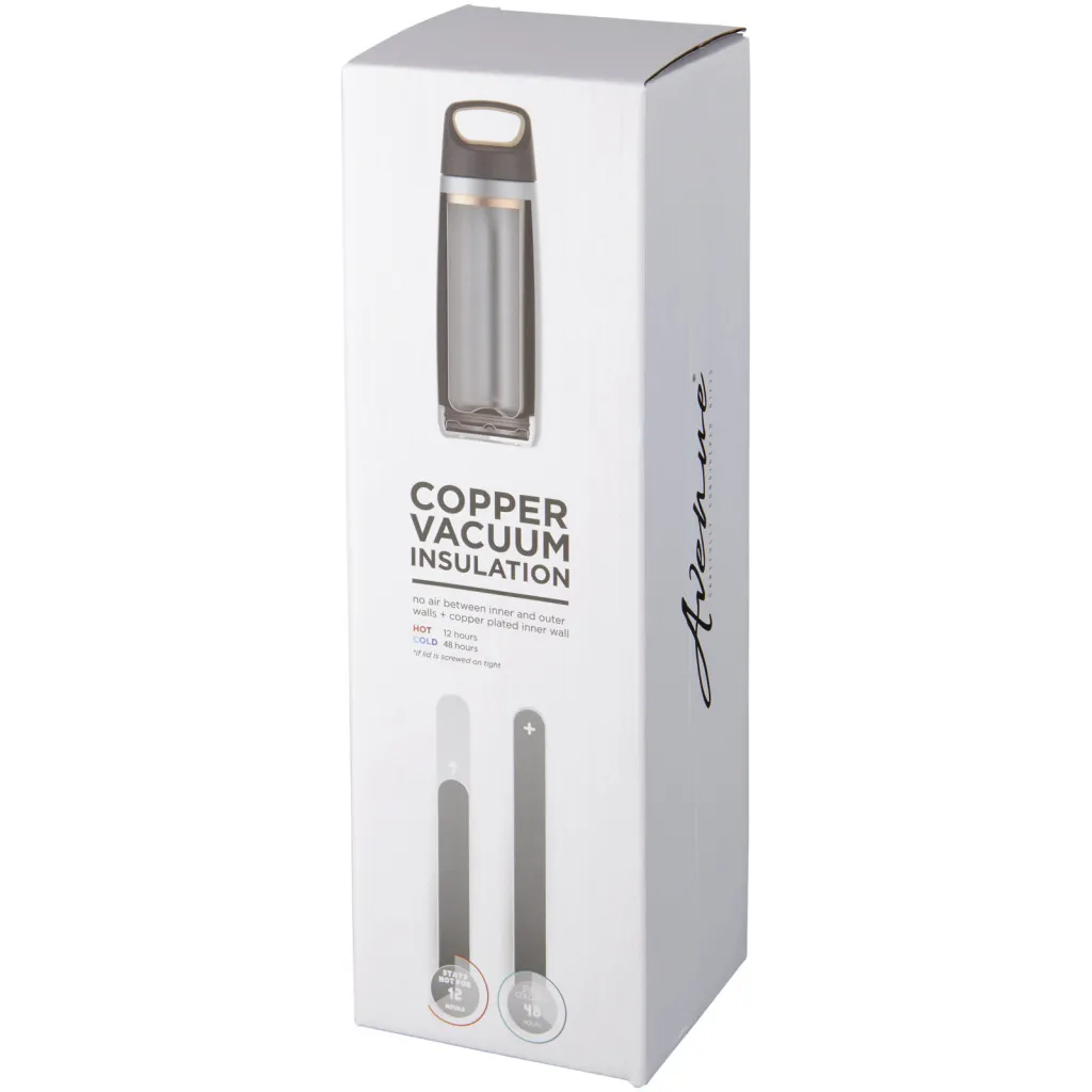 Double-wall stainless steel vacuum construction with copper insulation, which allows beverages to stay cold for 48 hours or hot for at least 12 hours. The construction also prevents condensation on the outside of the bottle. Screw-on lid with cork design details as well as a skid-proof bottom. Volume capacity is 600ml. Presented in an Avenue gift box.