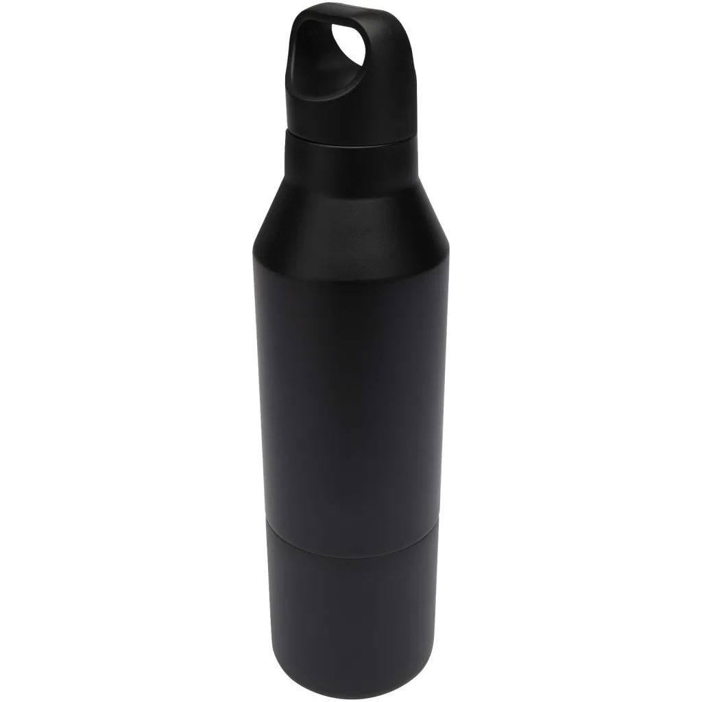 RCS certified stainless steel double wall copper insulated bottle with a removable cup. This multi-use bottle is designed to fit in the side pocket of a backpack, and has a convenient carrying handle that is integrated with the cap. Durable power coating on the outside. Keeps drinks hot for 12 hours or cold for 24 hours. Presented in a recycled cardboard gift box. Volume capacity bottle: 600 ml. Volume capacity cup: 300 ml.