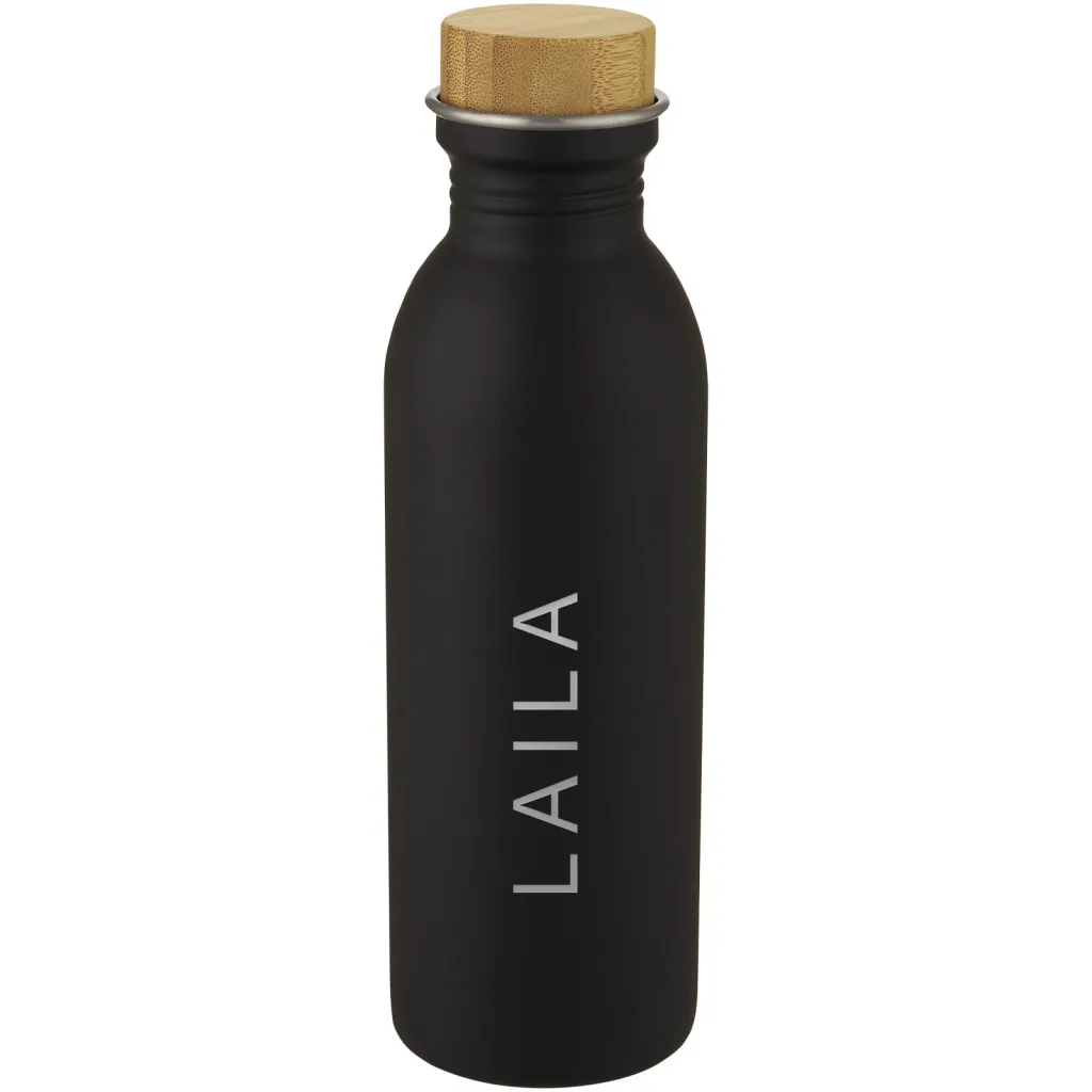 Single-walled 18/8 stainless steel sport bottle with a bamboo lid. BPA-free, tested and approved under German Food Safe Legislation (LFGB). Tested and approved for phthalates content according to REACH regulations. The bamboo used is from sustainable, environmentally and socially responsible sources. Volume capacity is 650 ml. Hand wash recommended. Presented in a recycled cardboard gift box.