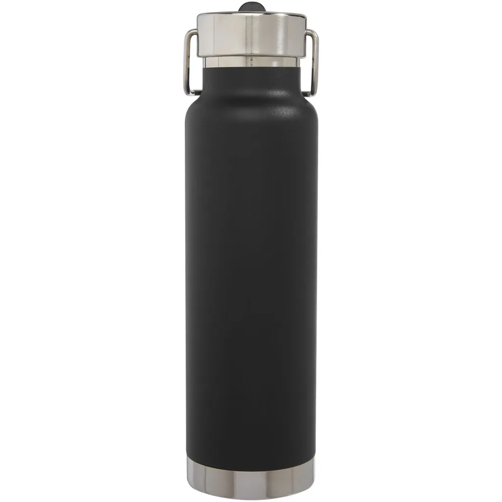 Durable and large double walled stainless steel vacuum construction with copper insulation that keeps drinks hot or cold for several hours. The construction also prevents condensation on the outside of the bottle, and the on-trend powder coating makes it extra durable. Stainless steel screw-on leakproof lid featuring an integrated straw and a durable stainless steel hand loop. Wide opening for easy filling, pouring and cleaning. BPA-free, tested and approved under German Food Safe Legislation (LFGB). Tested and approved for phthalates content according to REACH regulations. Perfect for ice cubes. Volume capacity is 750 ml. Hand wash recommended. Presented in a recycled cardboard gift box.