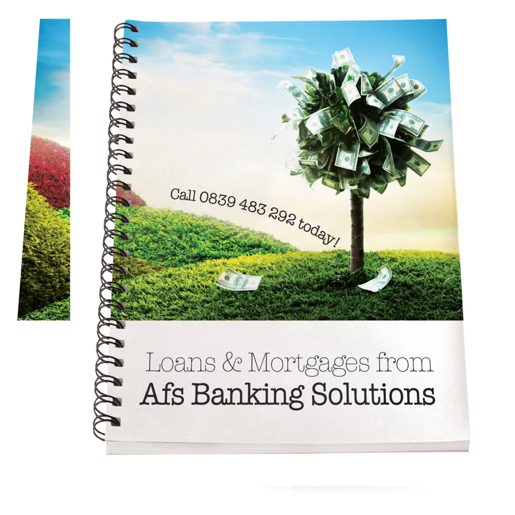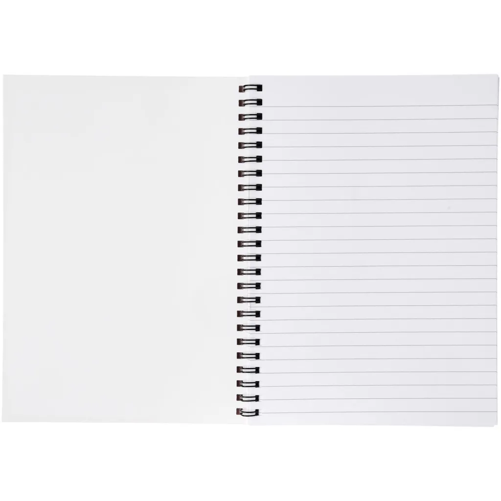 Desk-Mate® A4 spiral notebook. Includes 50 sheets (80g/m2) blank paper and (450g/m2) cover. The cover is tear- and waterproof. White colour wire. Decoration is possible on the cover and on each sheet.