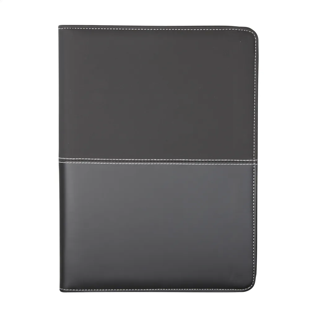 A4 sized, PU leather zipped document folder with 20 lined sheets notepad, pen and business card holder.