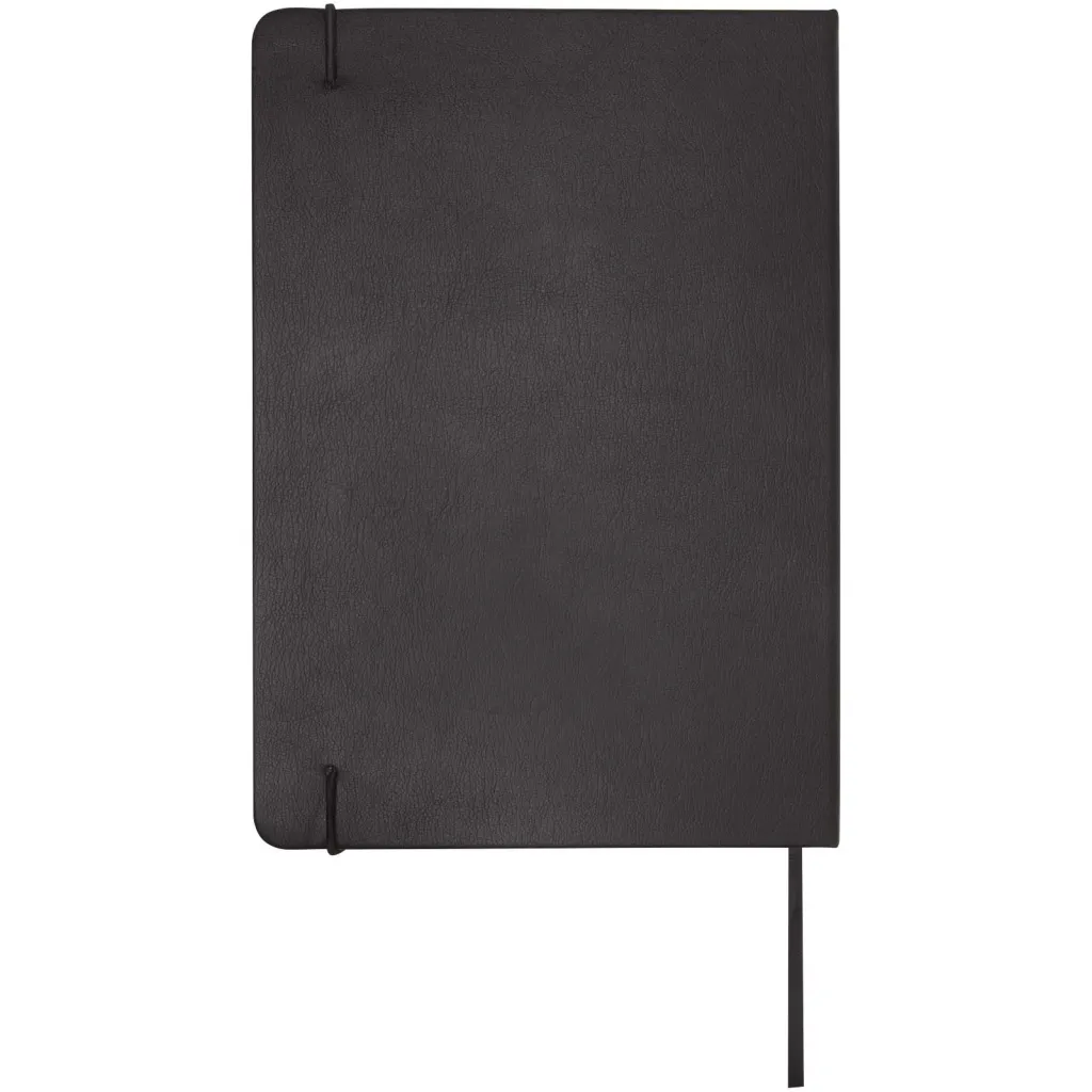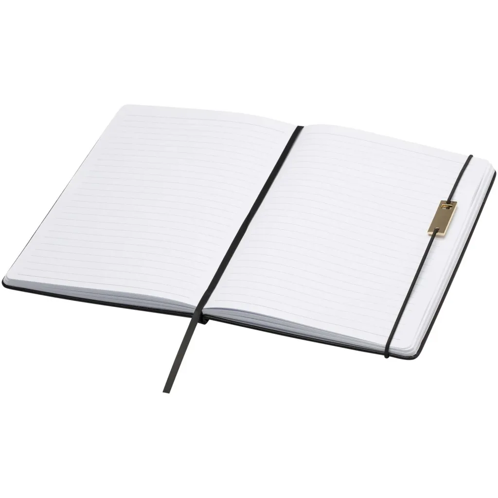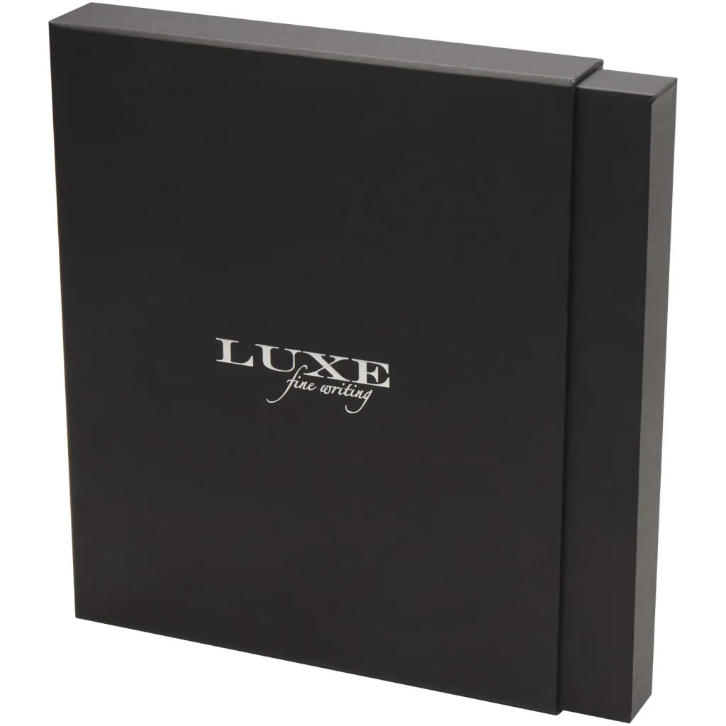The Legato is an elegant combination of an A5 notebook and a rollerball pen. The pen has a recycled brass upper barrel with gold chromed finish, lower barrel with a black/brown spray coating finish, metal gold chromed accessories, and a LUXE logo on the mid ring. Ink colour: Blue. Writing length: 400 metres. Nib size: 0.7 mm. The notebook has 80 sheets of 80 g/m² lined paper, and has a recycled plastic cover, an elastic closure, ribbon marker, and accordion pocket. Gold chromed metal accessory on the elastic closure. Delivered in a recycled cardboard gift box.