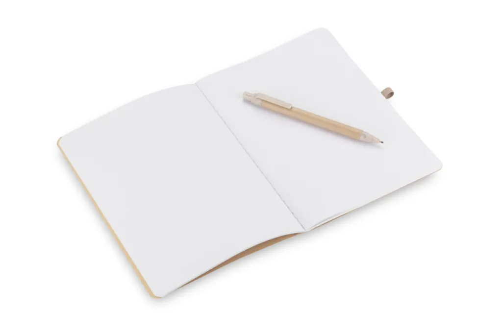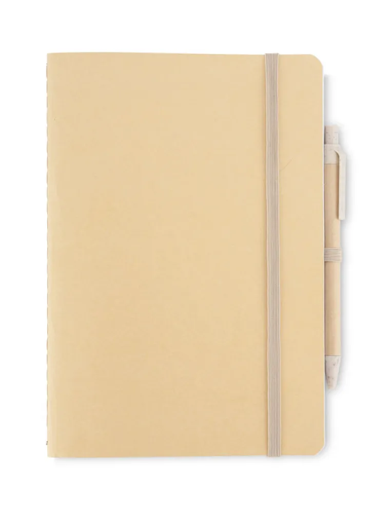 REMATT notebook in an ecological cover made of recycled paper in a classic brown colour. The notebook comes with a ballpoint pen with a blue refill, the body of which is made from recycled paper with wheat straw plastic trims. The notebook closes with a rubber band. Format A5.