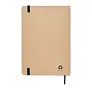 A5 notebook with hard recycled carton cover. Casebound. 160 squared recycled pages (80 sheets). Elastic closure strap, ribbon bookmark.