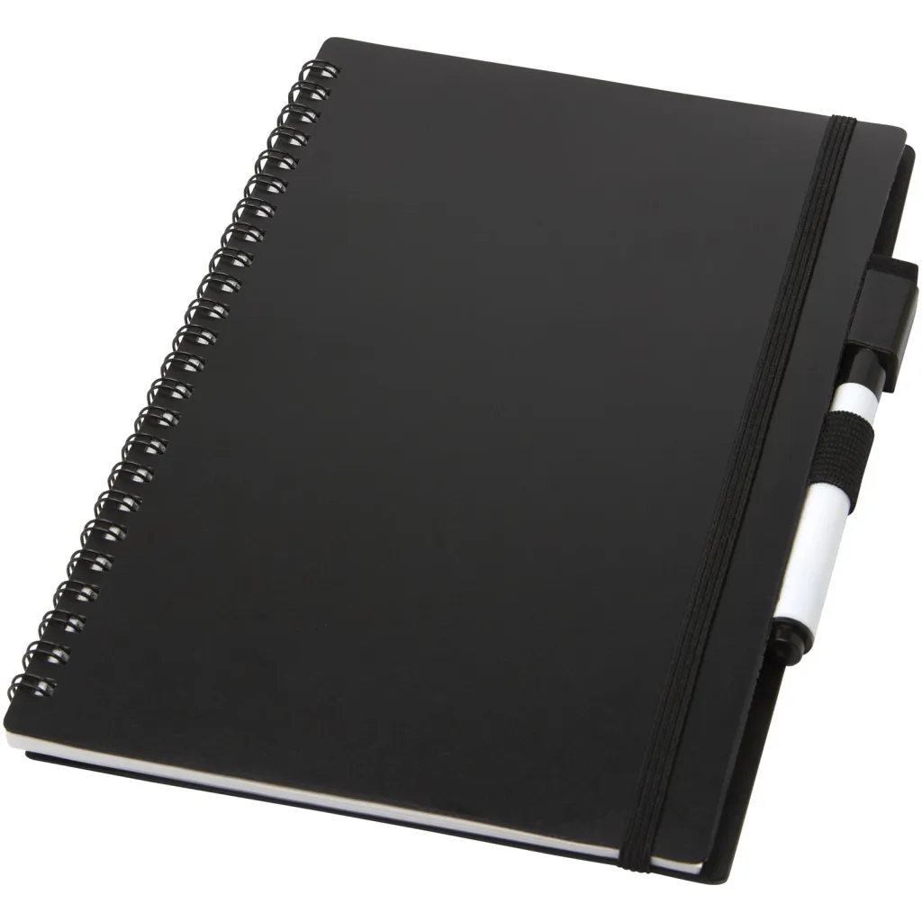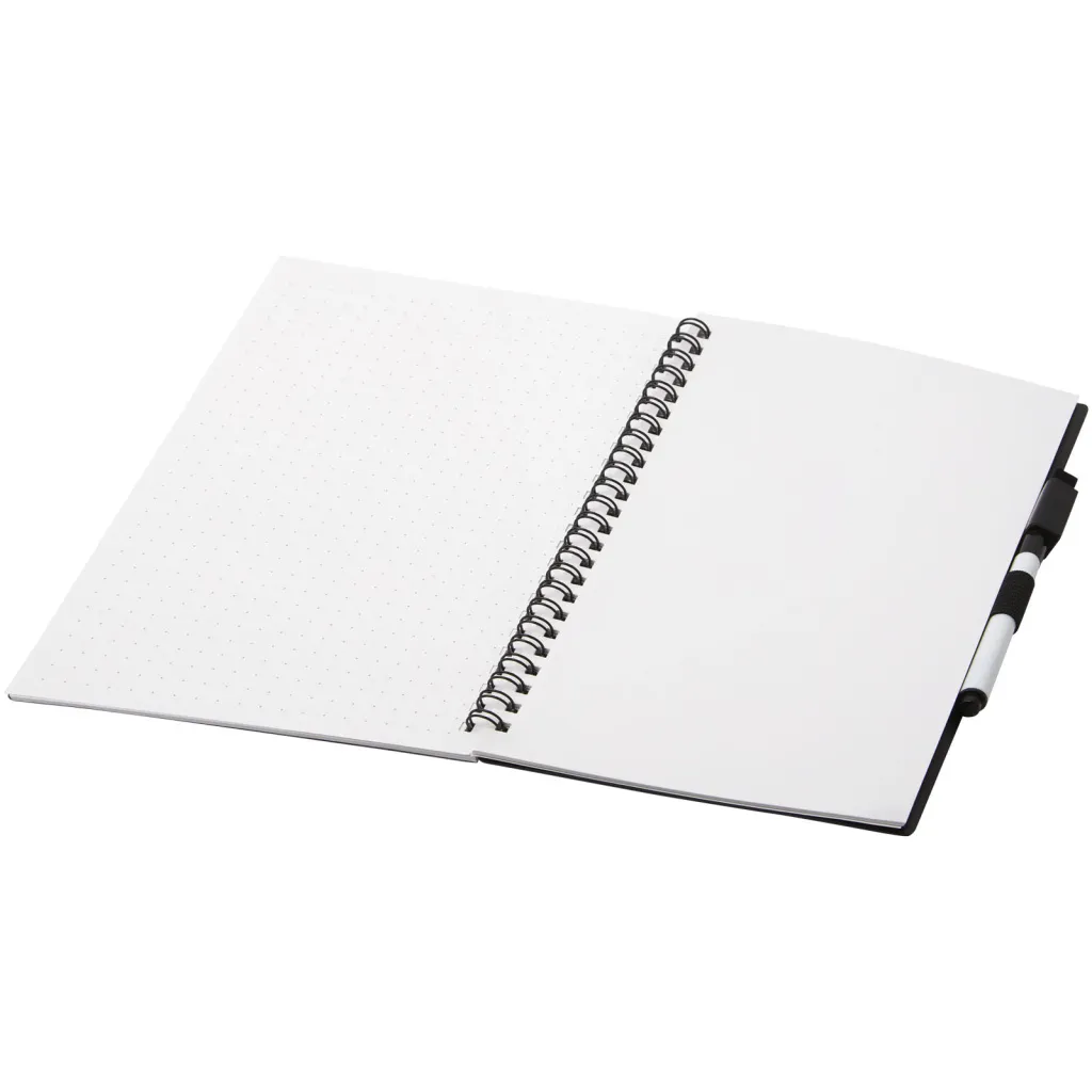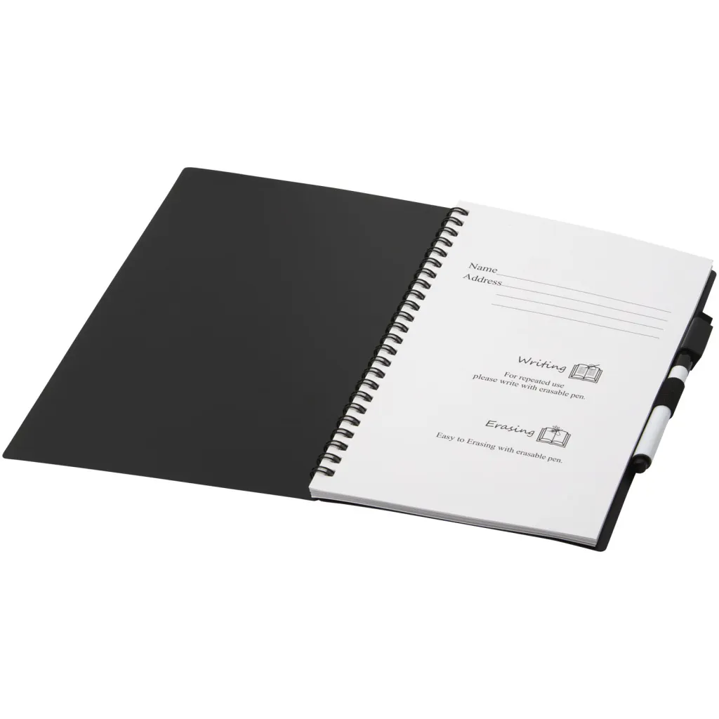 Sustainable notebook focused on reducing the use of paper to save the environment. After a while taking notes, drawing or brainstorming, the pages can be cleaned with the eraser on the marker to re-use the pages again. It can also be cleaned with a regular fabric cloth (not included). Features 20 sheets (40 pages) with half dotted and half blank layout, and a black writing marker.