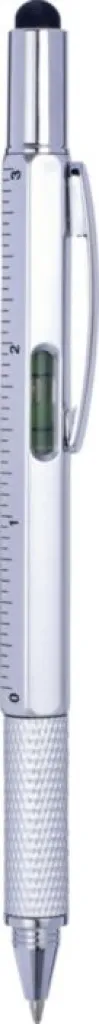 Mutltifunctional ABS ballpen with twist action mechanism. Including: a level, ruler, and rubber tip for capacitive screens. Black ink.