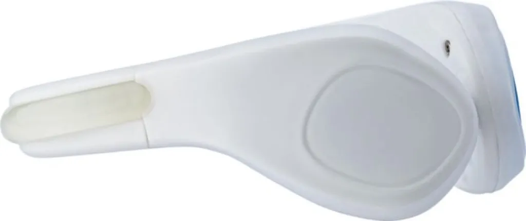 ABS and silicone shoe clip, with a red LED light with 2 blinking functions, and an on/off button. Batteries included.