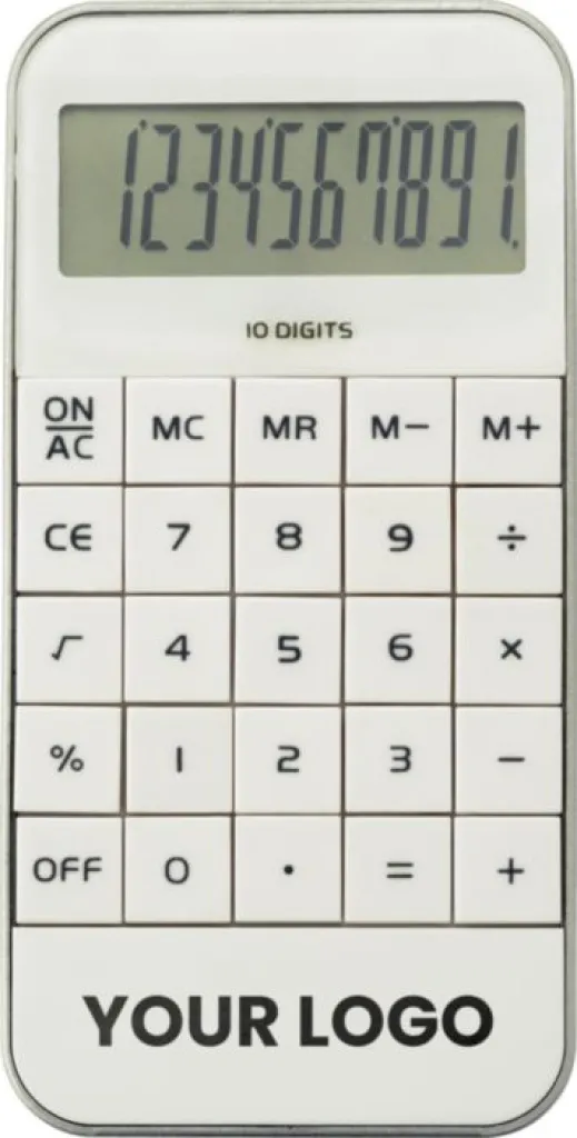 ABS mobile phone-shaped, ten-digit calculator with silver colored rim, including memory, percentage, and square root calculation functions. Batteries included.