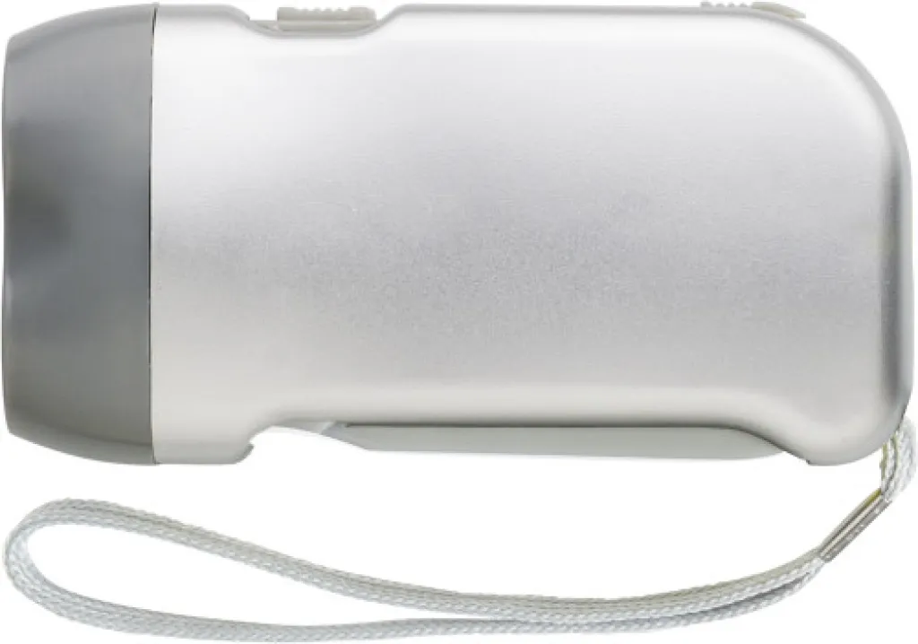 ABS dynamo self-charging torch with two LED light and wrist straps. Patent: EU Nr. 363627-0002.