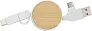 ABS extendable charging cable with bamboo details. With USB-C, lightning, and USB-A. Individually packaged in a brown cardboard pouch.