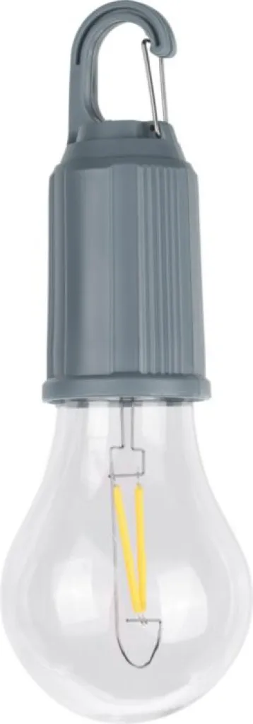 ABS lightbulb (60 lumens) with a 400mAh rechargeable battery. USB-C charging type. Features a metal clip and three light modes. IPX3.