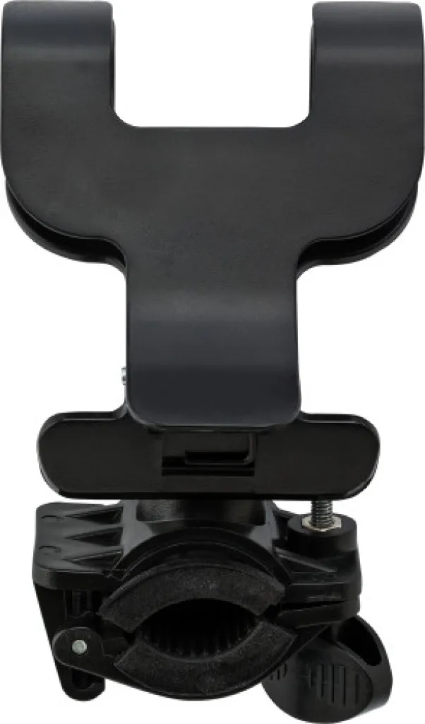 ABS adjustable mobile phone holder for a bicycle. The bracket to hold the mobile phone can be moved in several positions. The holder can be placed on the handlebar and adjusted to fit. The maximum rod diameter is between 15 and 19 mm, and the maximum opening for the phone holder is 9 cm.