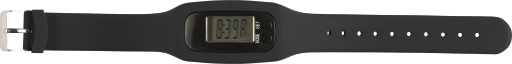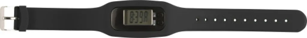Pedometer with silicone wristband. Records steps (up to 99.999), calories, and distance (miles/km). Batteries included. DC:1.5V.