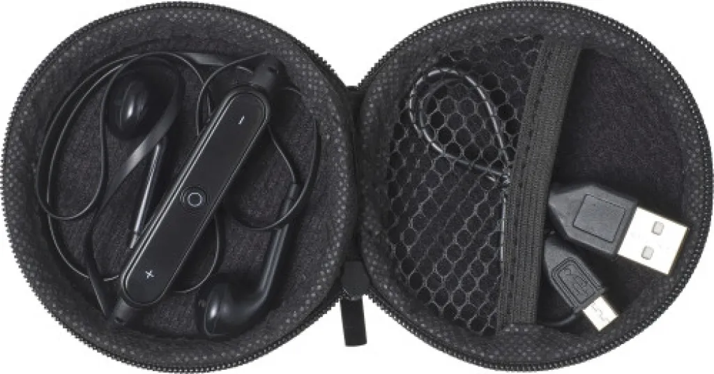 ABS in-ear earphones with wireless technology. Length of the cable: approx 68 cm. Including USB charging cable (approx. 30 cm). Packaged in pouch with zipper. The earphones match the case in color. The USB cable is black.