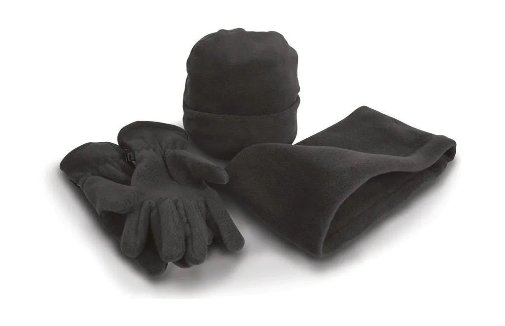 ·200 g/m² ·100% Polyester (Fleece) ·Anti-pilling ·Elasticated set with gloves, muffler and cap.