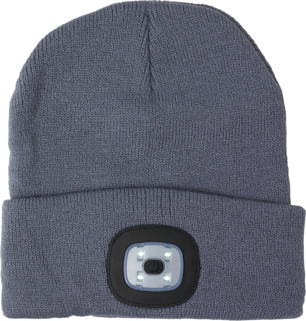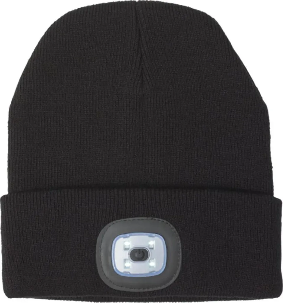 Acrylic beanie with a COB light with three brightness settings. Batteries included.
