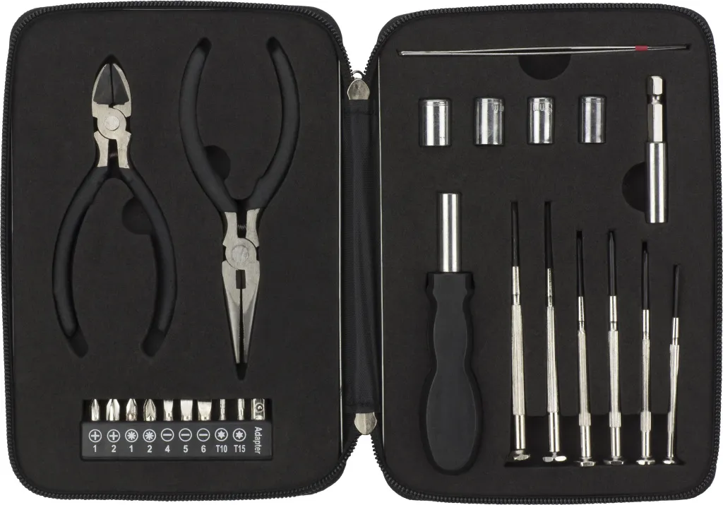 26-Piece aluminium and steel toolkit. Including: two pliers, a holder with nine different bits, an adapter, tweezers, four drive sockets, an adapter, a handle, and six different precision tools. Packaged in a metal case with zipper and EVA foam inlay.