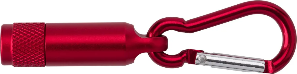 Aluminium mini torch with one LED light and carabiner to function as keychain.