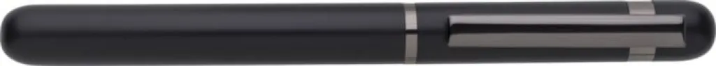 Aluminium and brass rollerball pen. With shiny details on the clip, ring, and push button. Blue ink. Individually packaged in magnetic giftbox with paper sleeve.