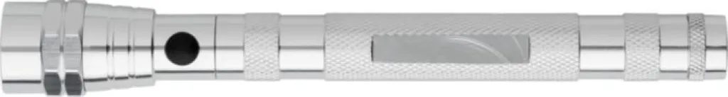 Aluminium torch with three LED lights, telescopic function and flexible end. Includes a strong magnet on one end for hanging from the hood of the car, and a flat area on the handle for printing purposes. Batteries included.