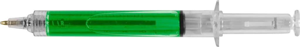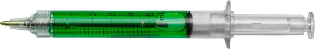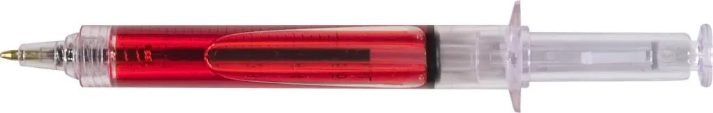 AS syringe-shaped ballpen with colored liquid. Black ink.