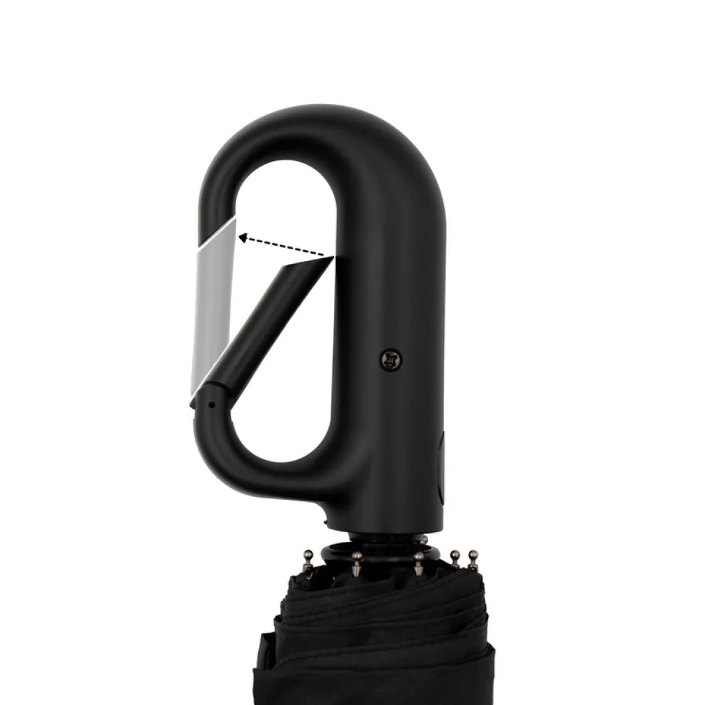 Automatic umbrella, features 8 panels and plastic handle with button and carabiner clip for attaching, automatic opening and folding function, hook and loop closing, black sleeve included, product materials include pongee 180T.