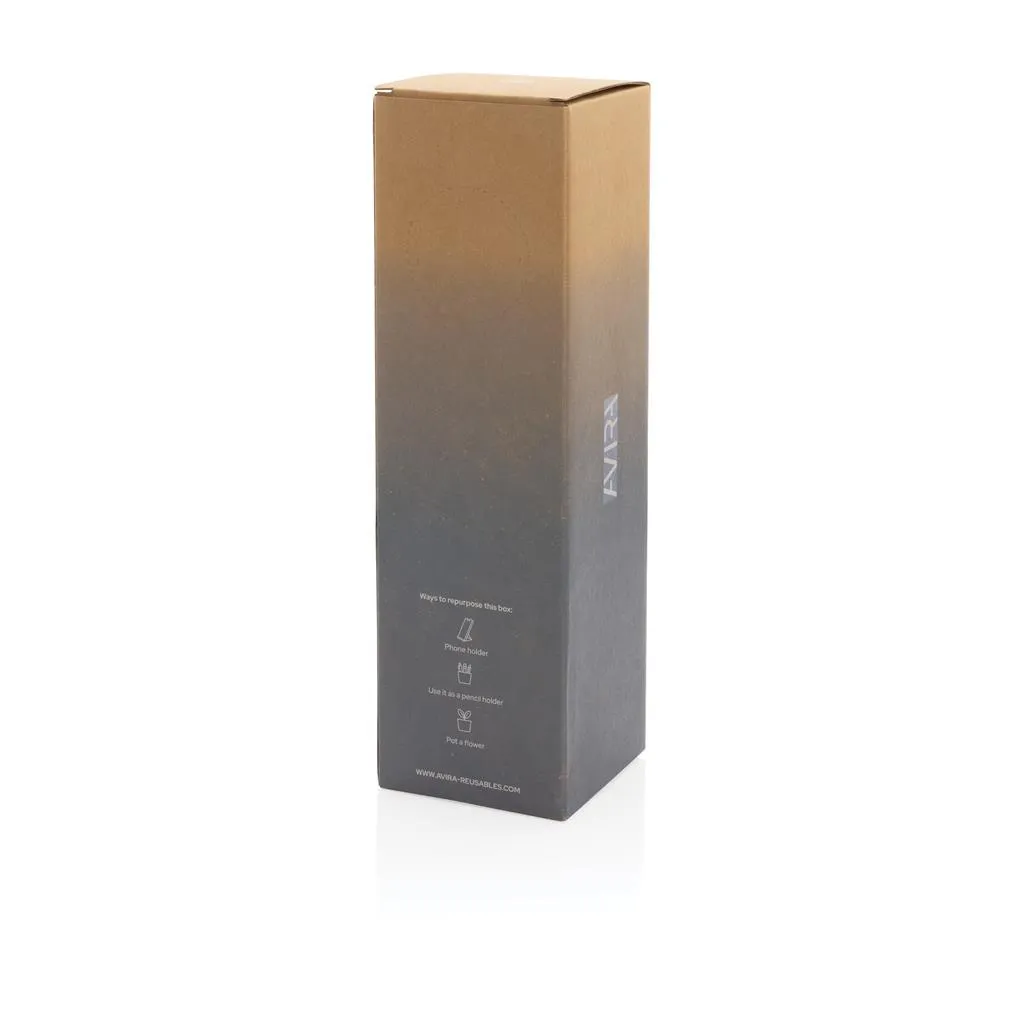The Avior RCS Recycled stainless steel vacuum bottle is designed for long-lasting enjoyment of your drinks! The double-wall recycled stainless steel vacuum construction keeps beverages chilled for up to 20 hours or warm for up to 10 hours. This bottle fits most standard car cup holders so you can bring it with you anywhere. Made with RCS (Recycled Claim Standard) certified recycled materials. RCS certification ensures a completely certified supply chain of the recycled materials. Total recycled content: 97% based on total item weight. BPA free. Capacity 500ml. Including FSC®-certified kraft packaging. Repurpose the box into a phone holder, pencil holder or flower pot!