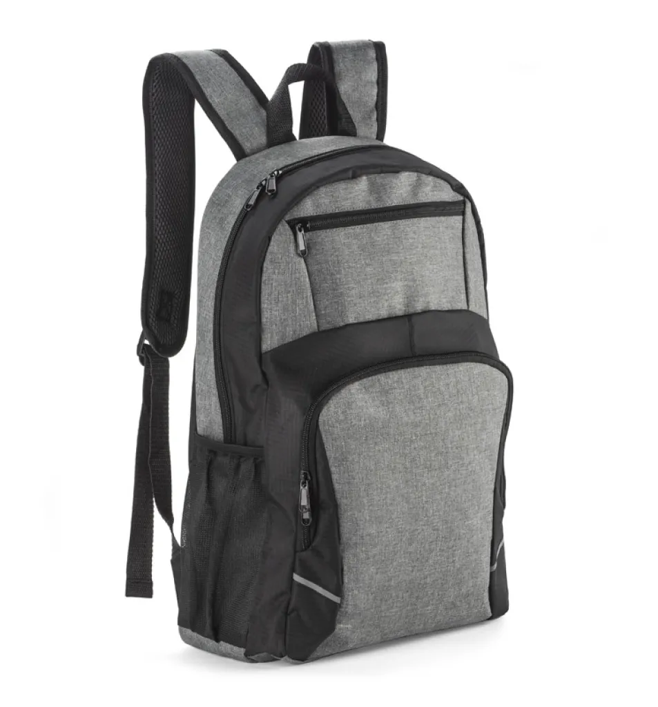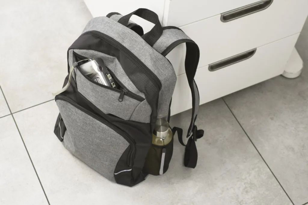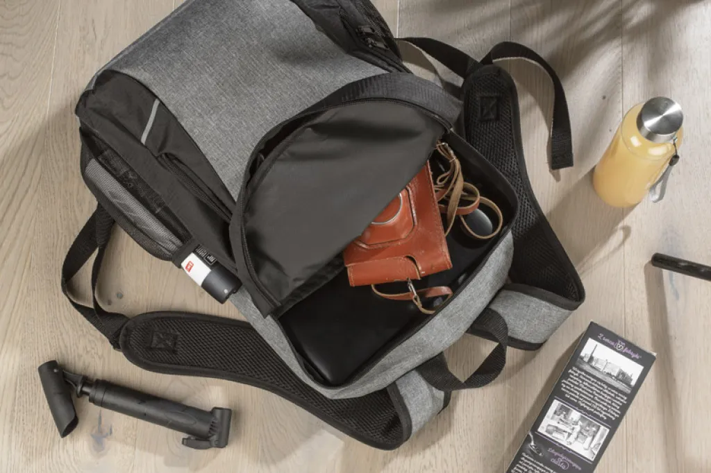The UTILE backpack is made of 600D RPET polyester, which makes it more environmentally friendly. It has one main compartment with two zippers. There is also an additional open compartment inside. The bottom of the backpack is covered with a waterproof PVC coating. There are two zippered pockets on the front: a large one that can fit a lunch and a smaller one, just right for smaller items. On both sides there are small mesh pockets with an elastic band. The back is slightly reinforced.
