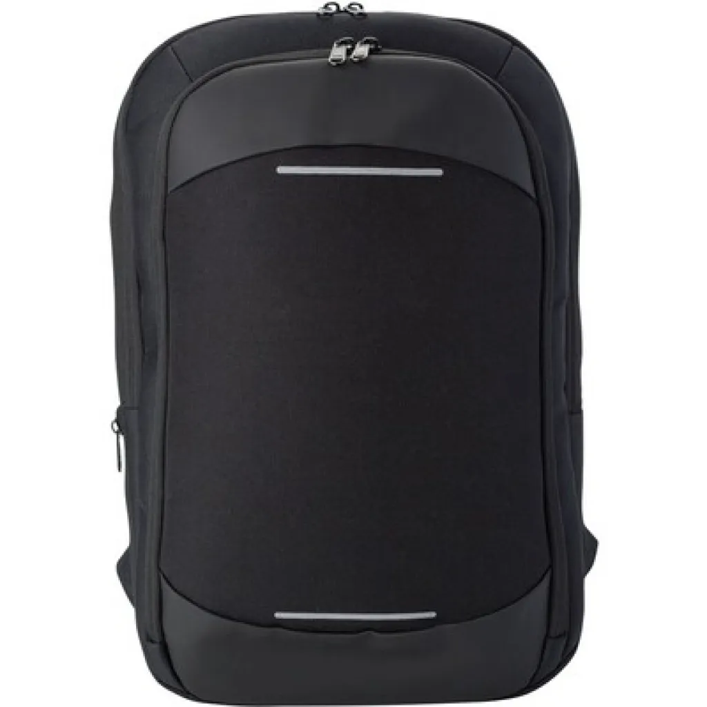 Backpack, zipped main compartment and front pocket, soft and adjustable shoulder straps, zipped hidden pocket in the back, shiny stripes on the front