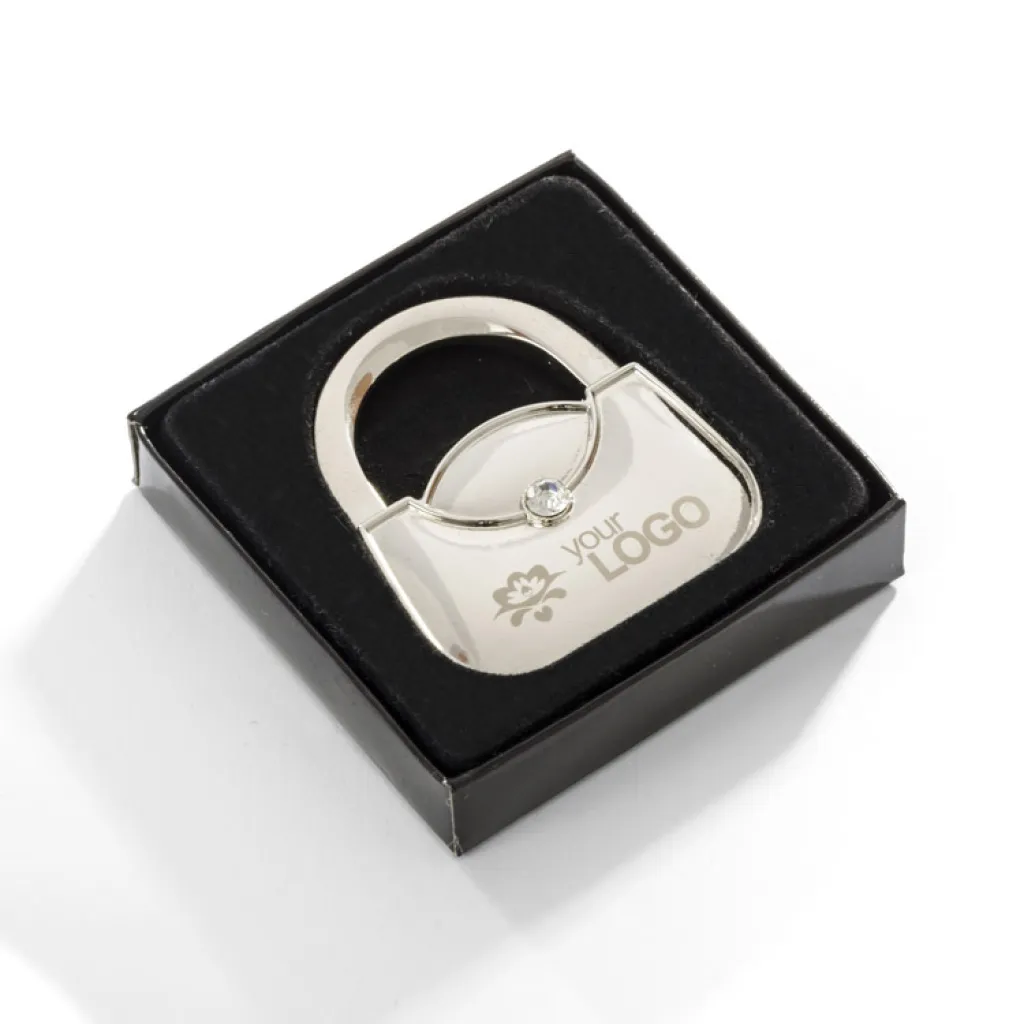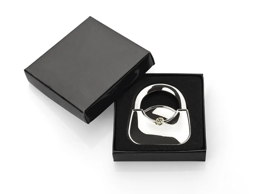 Foldable, handbag shaped bag hander made of metal. This bag hanger is decorated with elegant glass. Product is packed in black box. Logo may be engraved on product.