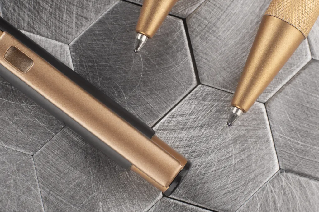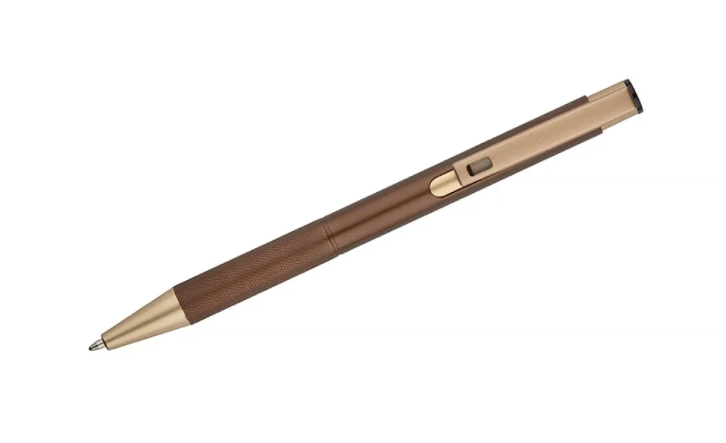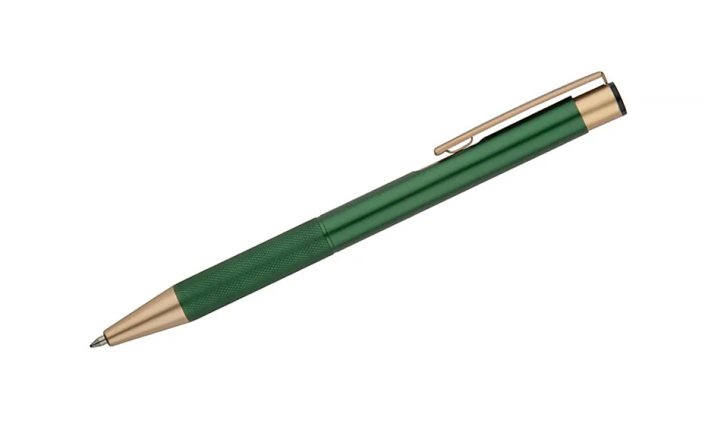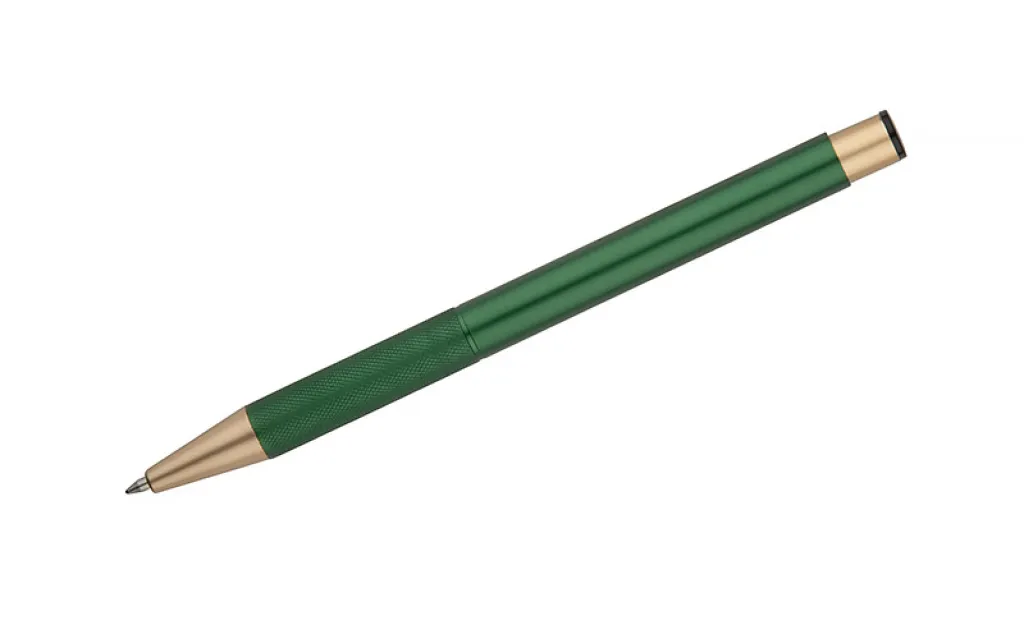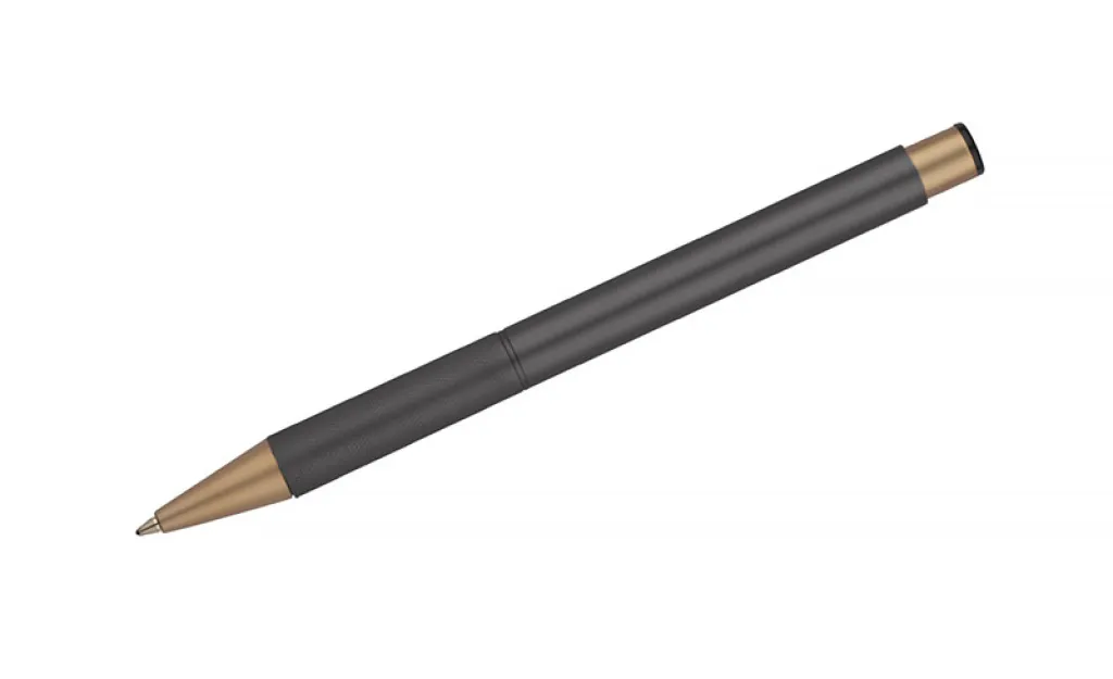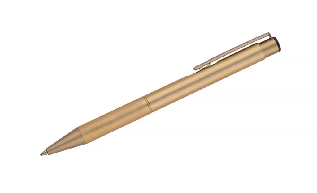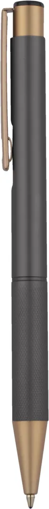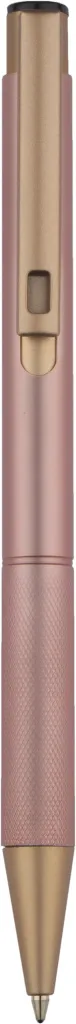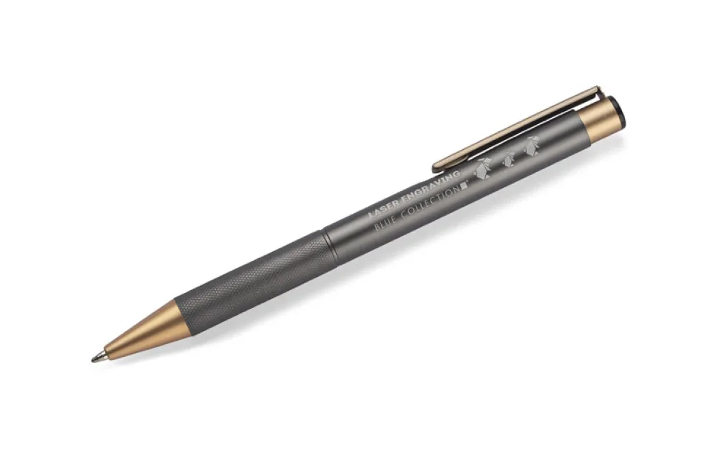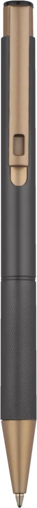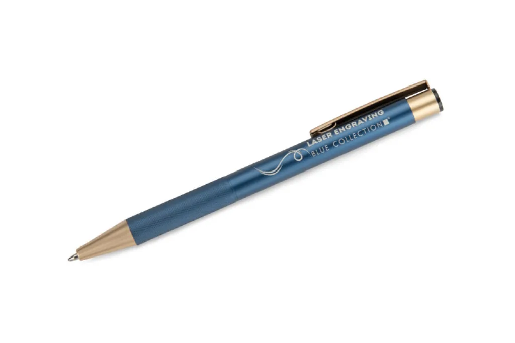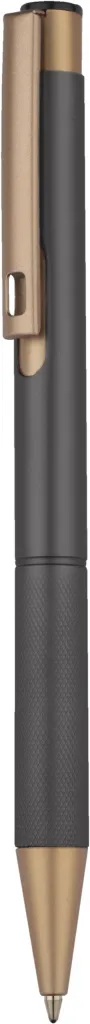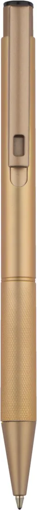 Elegant aluminum pen. Gold-coloured finishes. Blue semi-gel refill.