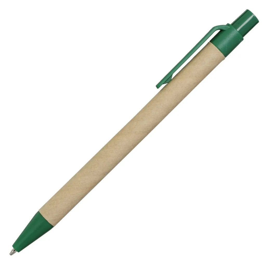 Recycled cardboard ballpoint pen with recyclable plastic elements, blue refill.