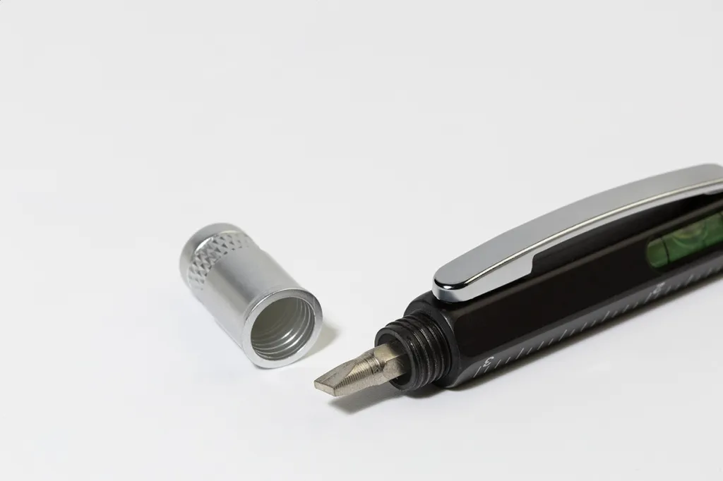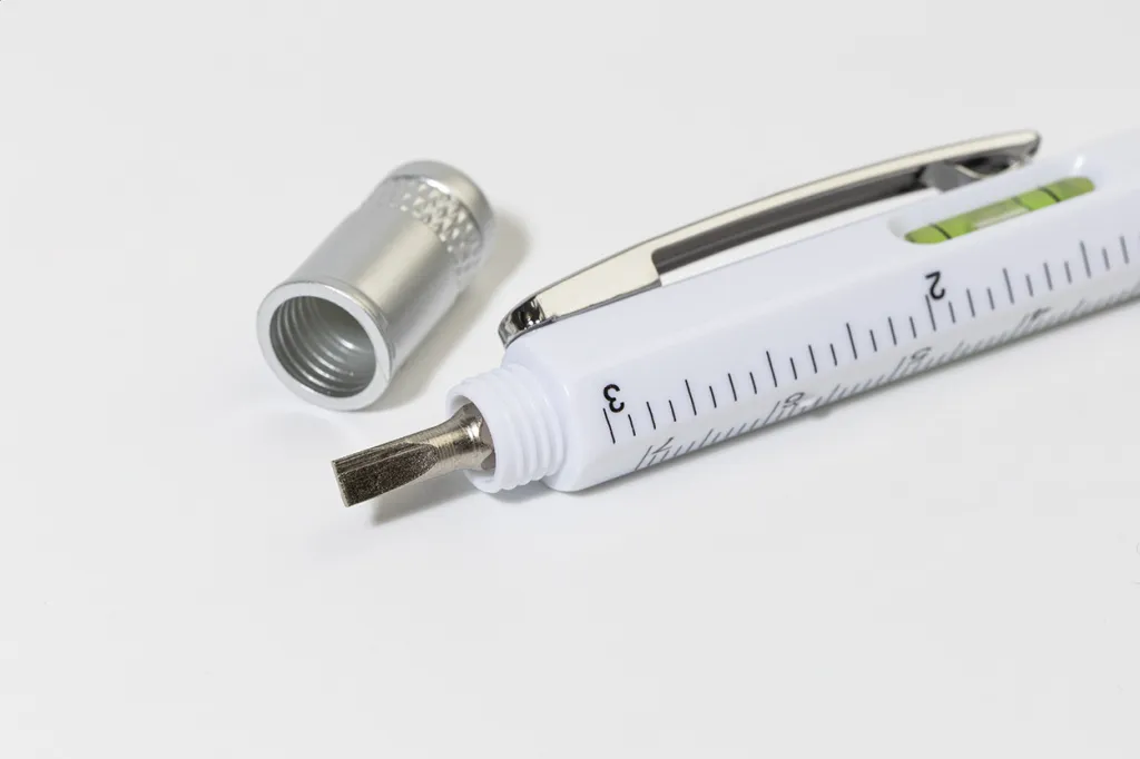 Plastic ballpoint pen with screwdriver, spirit level and 7 cm ruler. With blue refill.