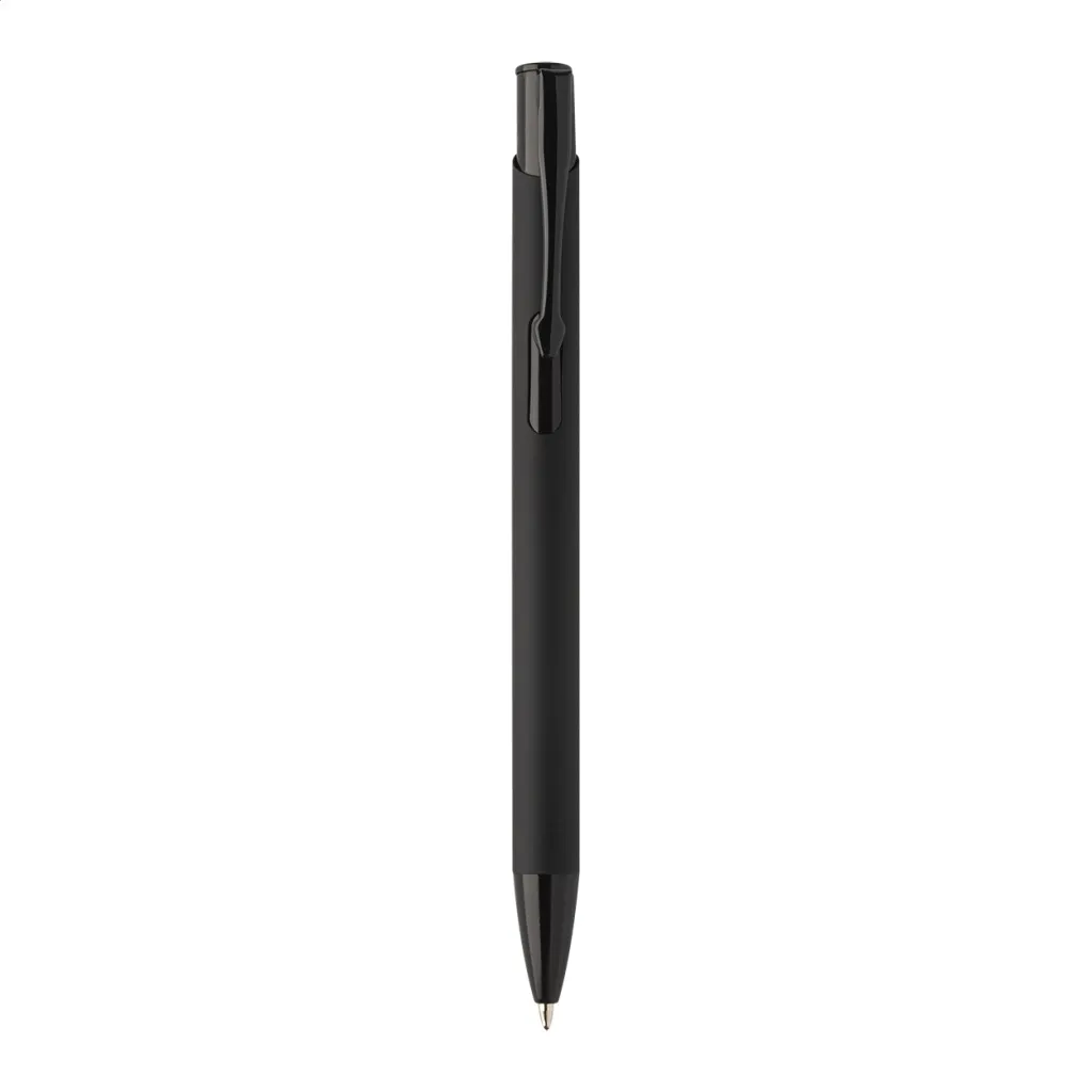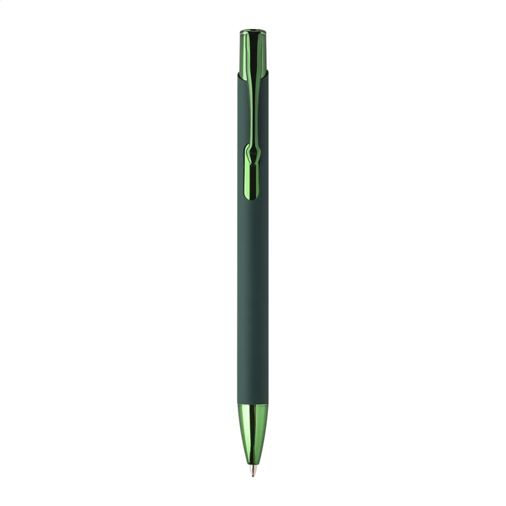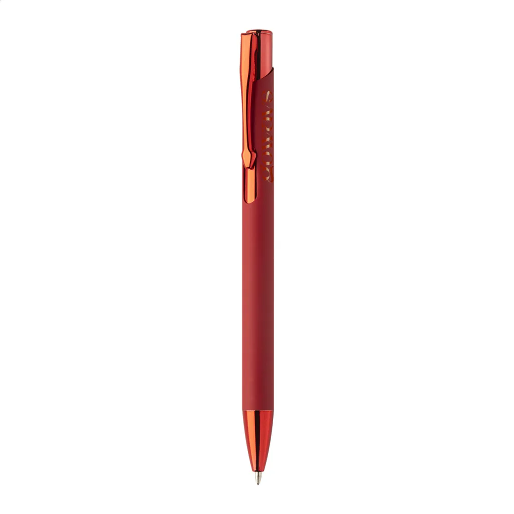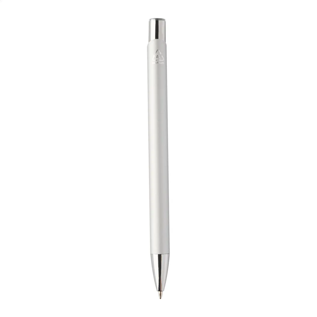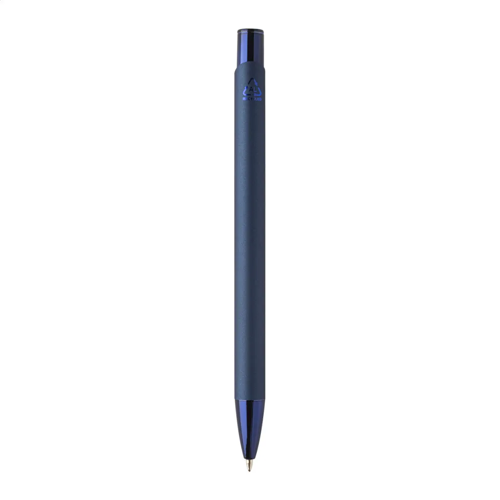 Recycled aluminium ballpoint pen with rubberized body and coloured shiny metallic finish parts. With special coating for mirror engraving matching the metallic parts. With blue refill.
