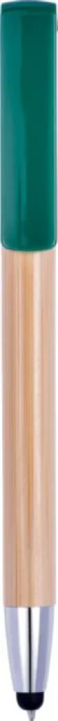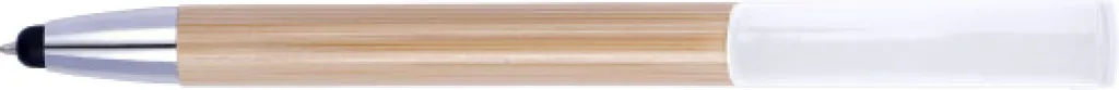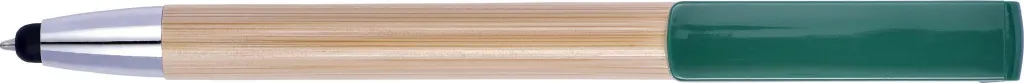 Bamboo ballpen with rubber tip for capacitive screens and plastic tip and clip. The clip doubles as a smart phone stand. Blue ink.